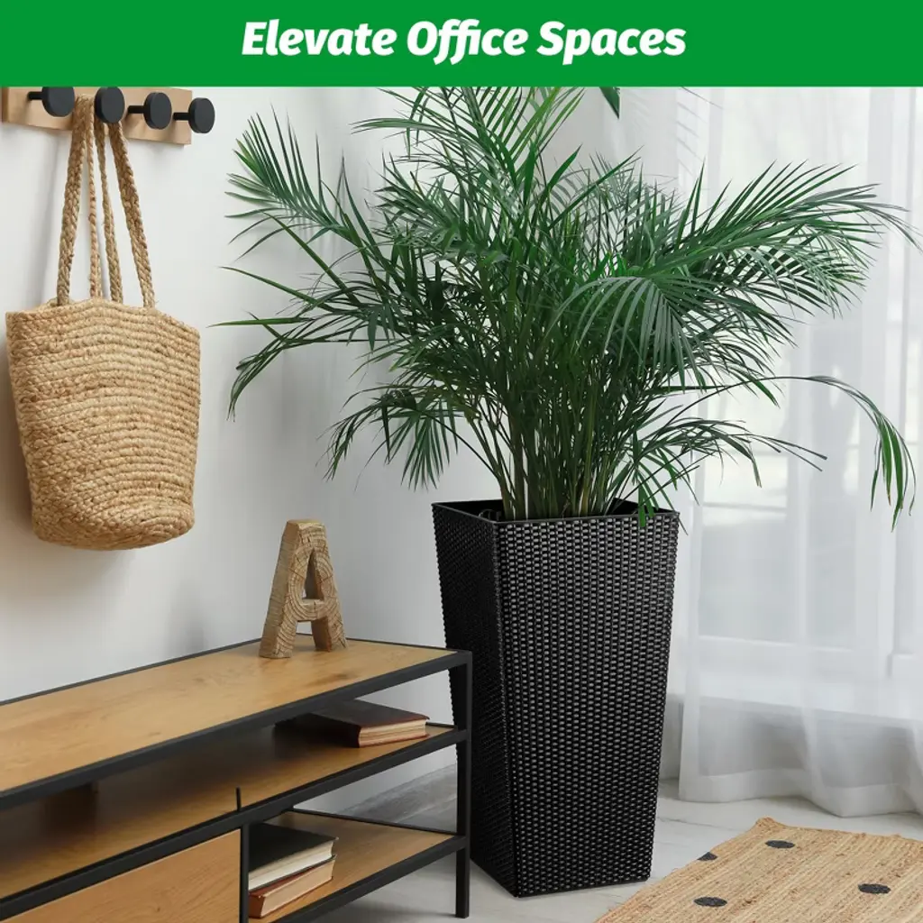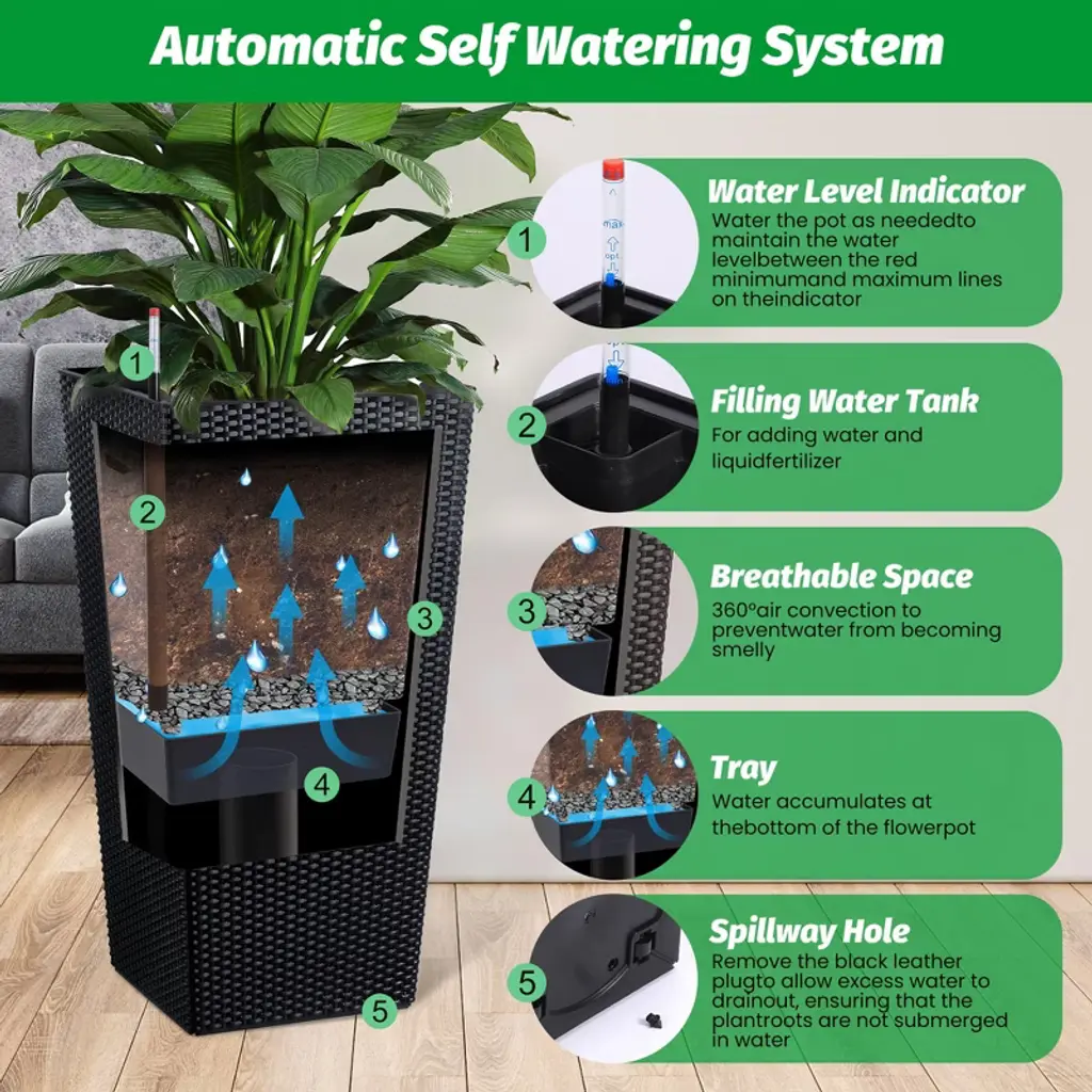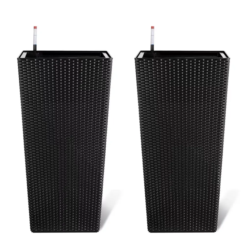 30 Inch Tall Planter Set Of 2 Large Rattan Flower Pot With 2 Trays & A Water Level Monitor & Wheels Outdoor And Indoor For Patio, Porch, Black