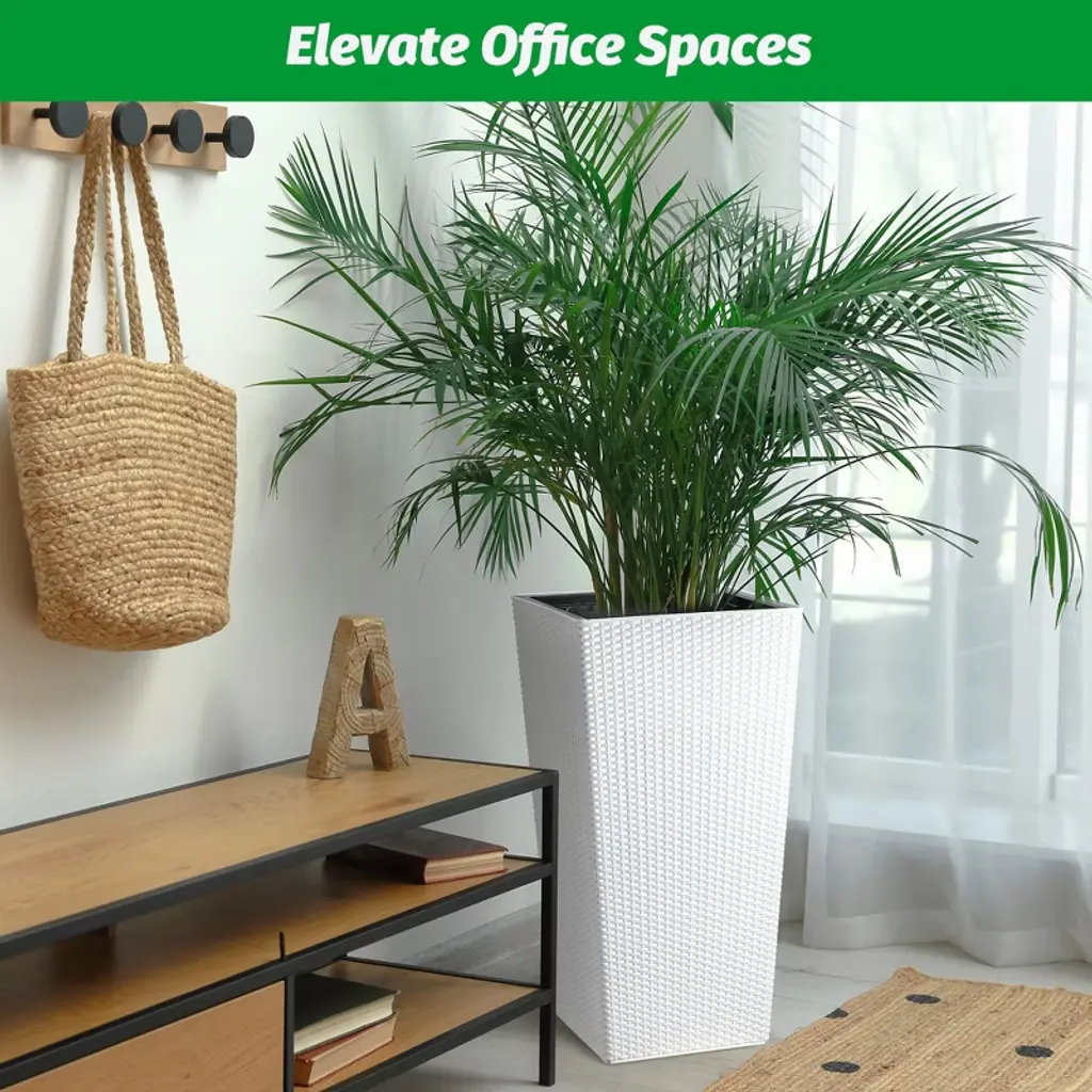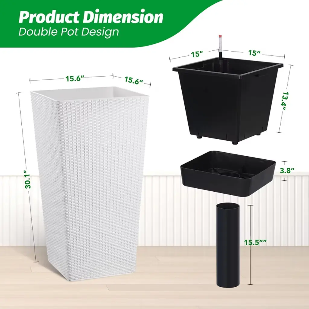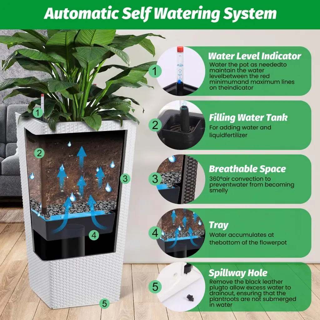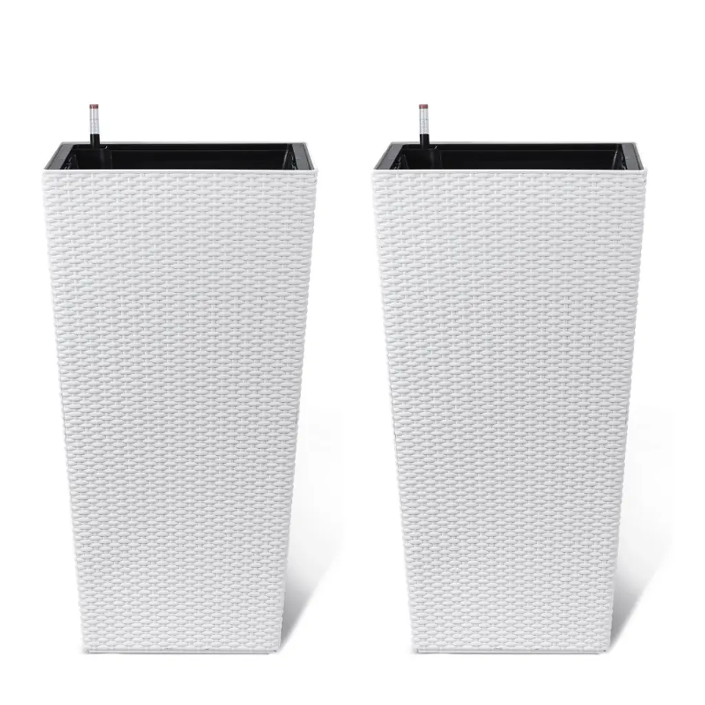 Enhance your indoor or outdoor space with this set of 2 large 30-inch tall rattan flower pots. Designed with a self-watering system, these planters feature 2 removable trays, a convenient water level monitor, and built-in wheels for easy mobility. Crafted from durable, weather-resistant materials, they are perfect for flowers, tall trees, or faux plants, maintaining their beauty in any season. The elegant rattan texture adds a stylish touch, making them ideal for gardens, patios, balconies, or living rooms.