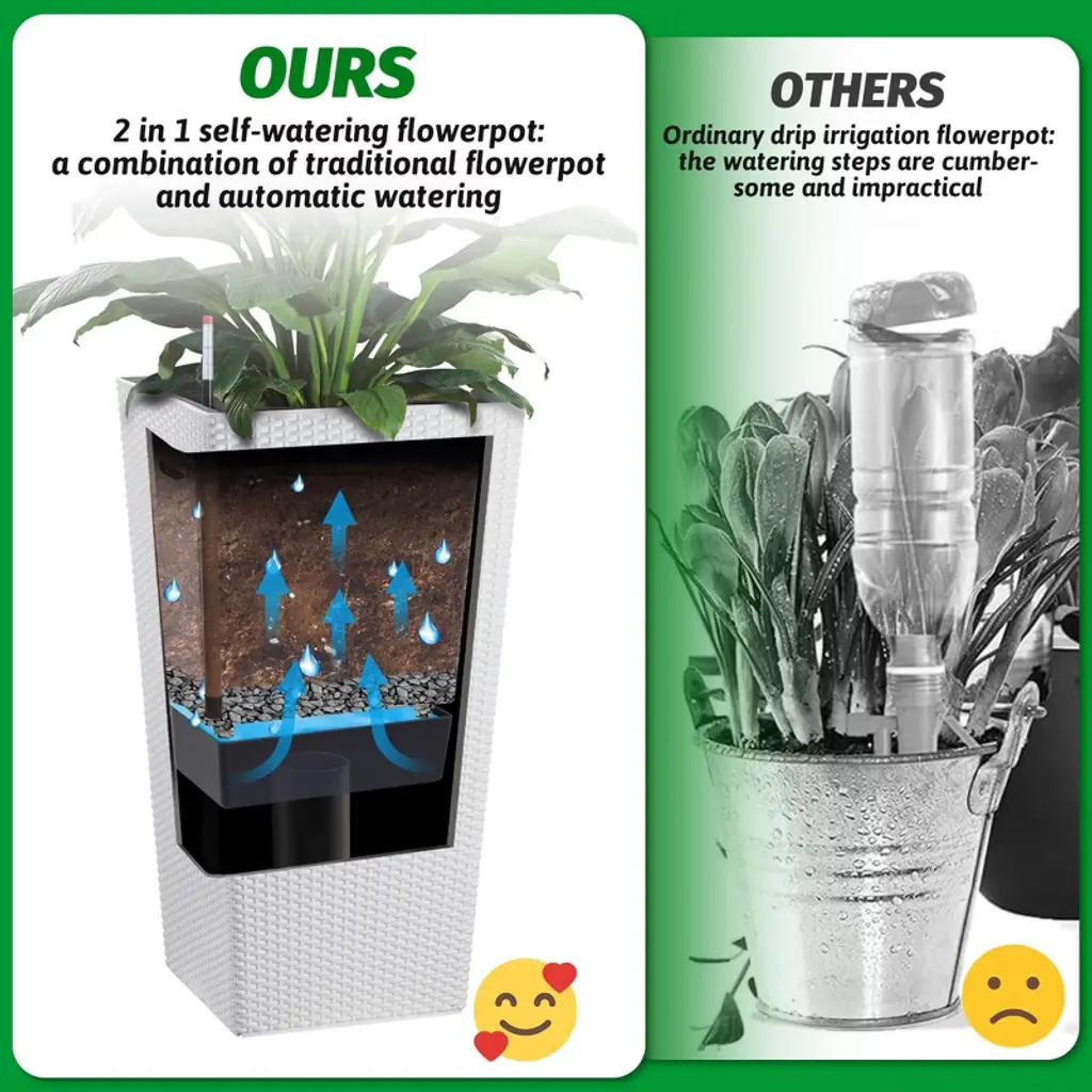 30" Tall Rattan Flower Pot, Self-watering Planter With Wheels, Water Level Monitor & 2 Trays (2 Pcs)