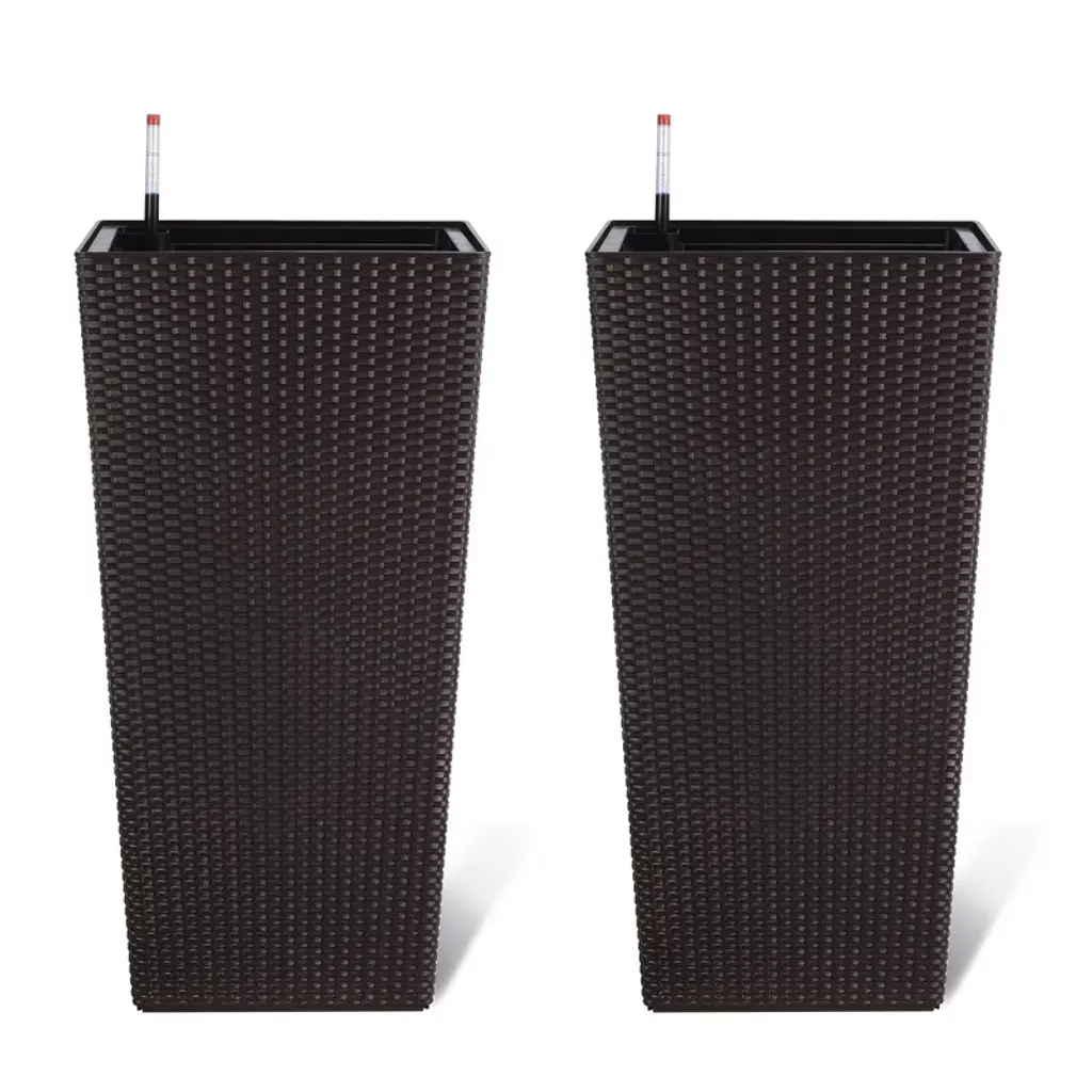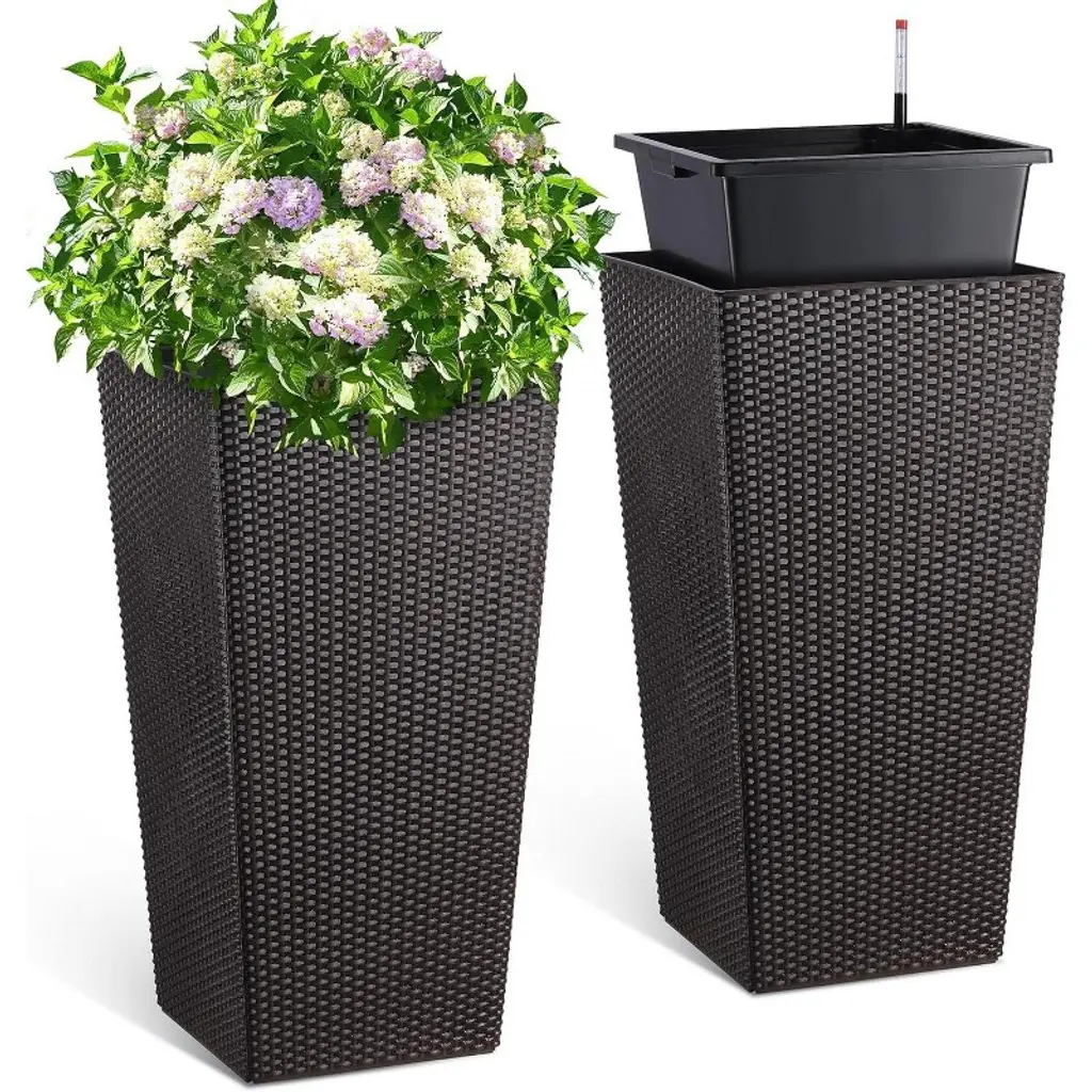 Enhance your indoor or outdoor space with this set of 2 large 30-inch tall rattan flower pots. Designed with a self-watering system, these planters feature 2 removable trays, a convenient water level monitor, and built-in wheels for easy mobility. Crafted from durable, weather-resistant materials, they are perfect for flowers, tall trees, or faux plants, maintaining their beauty in any season. The elegant rattan texture adds a stylish touch, making them ideal for gardens, patios, balconies, or living rooms.