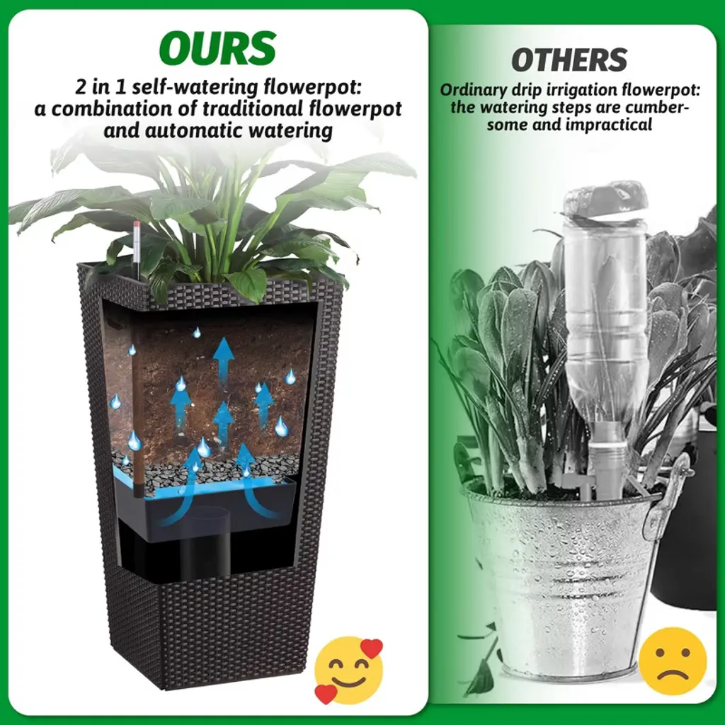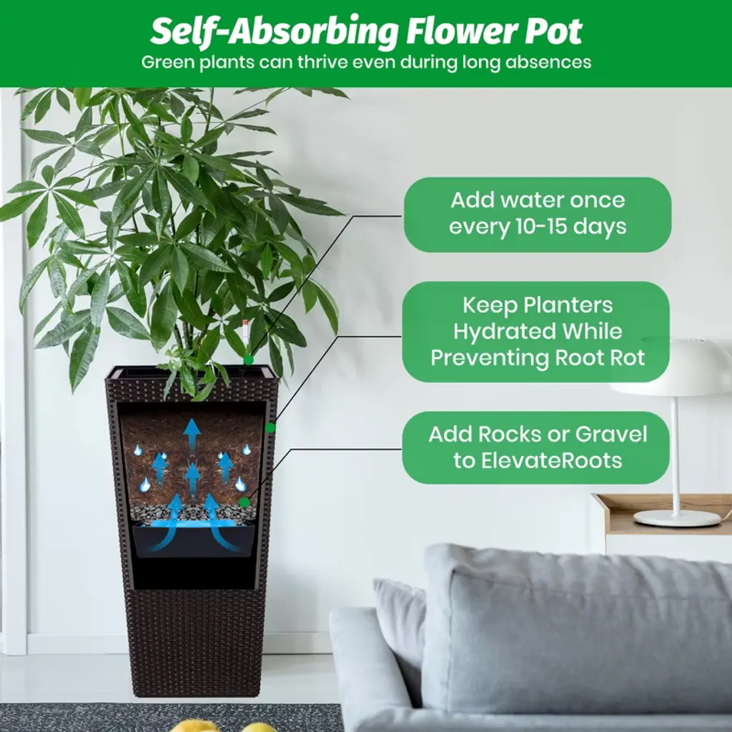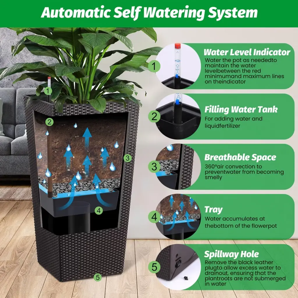 30" Tall Rattan Flower Pot, Self-watering Planter With Wheels, Water Level Monitor & 2 Trays (2 Pcs)