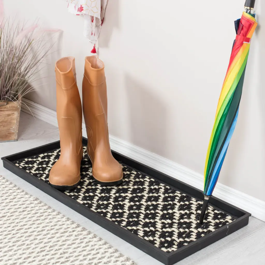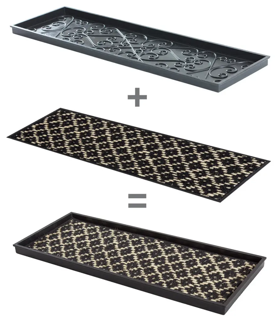 Boot trays don''t have to be boring. The foundation of this collection begins with a premium, heavy-duty, waterproof tray made of natural and recycled rubber featuring a classic scroll design. To that we have added an easily removable insert that is available in a variety of stylish patterns and woven from natural, durable coir fiber. This insert adds a pretty punch to your decor and cleans up simply just remove insert, shake out debris, hose off insert, air dry and you are back in business. Genius! Now go outside, do what you do and know that your footwear has a safe and smart place to rest when you get back home.