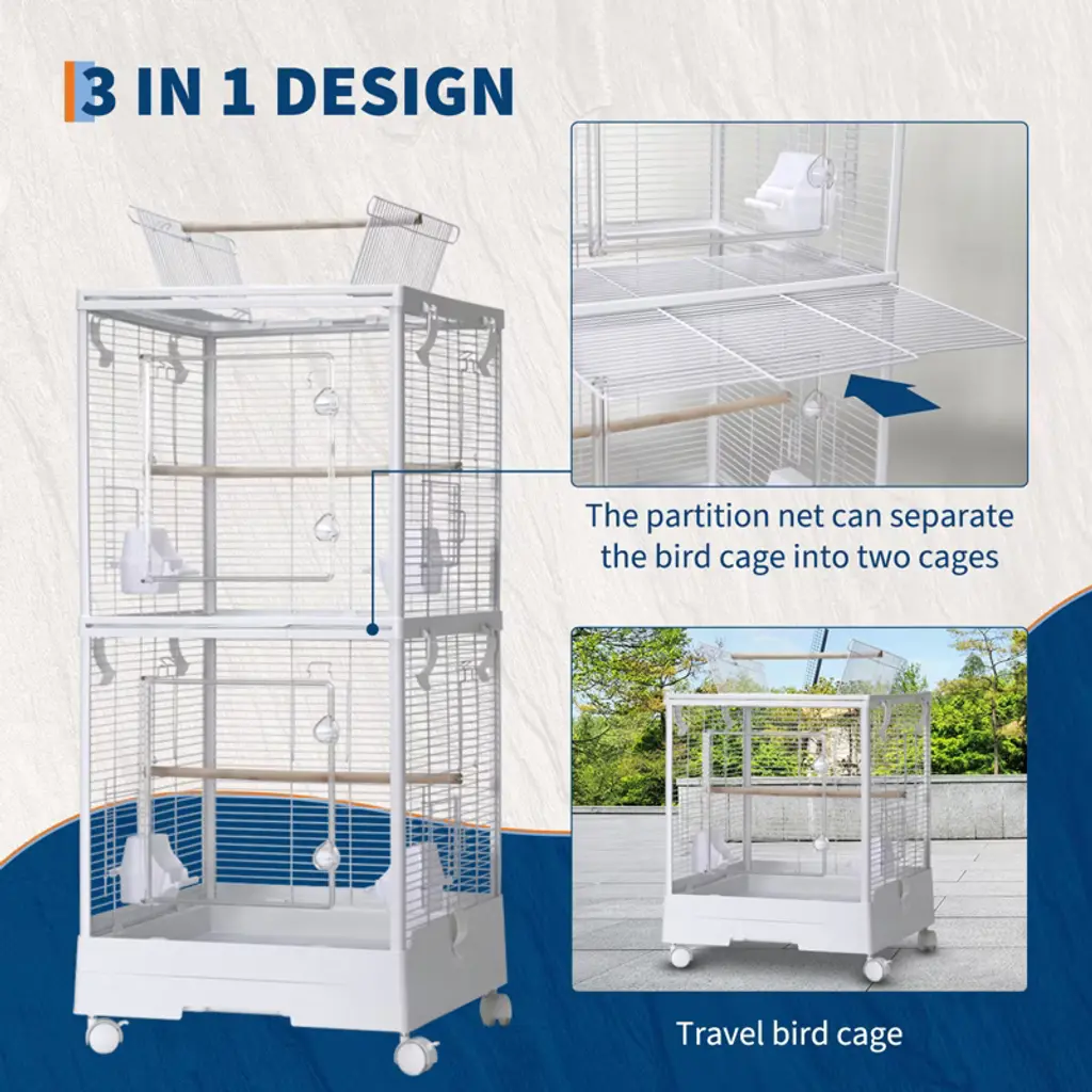 44 Inch Small Bird CageTurn your bird's habitat into a playground of joy for your feathered pets with our 3 in 1 bird cage – where open top doors meet easy to clean tray, designed to keep them safe while you enjoy convenient maintenance! Brief Overview-3 in 1 Bird Cage: Home, Travel & Aviary in a Single Design-Full-View Open Top Doors for Curious Birds-Non-Toxic Yet Industrial-Strong Parrot Cage-Hassle-Free Cage Maintenance with Slide-Out Debris Tray-Smart Living Space: Where Avian Needs Meet Owner Convenience SpecificationStyle: Modern,Small Size: RectangleFrame Material: Metal & PlasticColor: WhiteProduct Dimensions: 18.5'' L x 18.5'' W x 44'' H Packing List1 x Small Bird Cage1 x Installation Manual1 x Hardware Bag Usage Tips1. Ensure the lockable wheels are engaged before placing the cage, and regularly check perch stability to prevent accidents.2. For hygiene, wipe the spill-proof cups daily and clean perches weekly with bird-safe disinfectant.3. Position the cage away from drafts/direct sunlight, and use the wide-access doors for stress-free interaction."