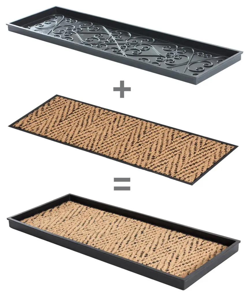 Boot trays don''t have to be boring. The foundation of this collection begins with a premium, heavy-duty, waterproof tray made of natural and recycled rubber featuring a classic scroll design. To that we have added an easily removable insert that is available in a variety of stylish patterns and woven from natural, durable coir fiber. This insert adds a pretty punch to your decor and cleans up simply just remove insert, shake out debris, hose off insert, air dry and you are back in business. Genius! Now go outside, do what you do and know that your footwear has a safe and smart place to rest when you get back home.