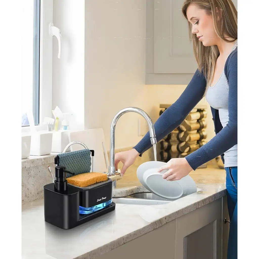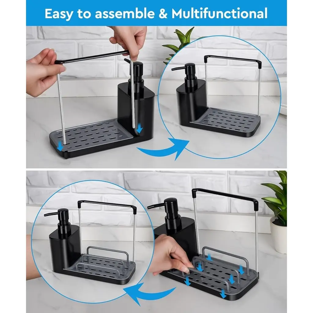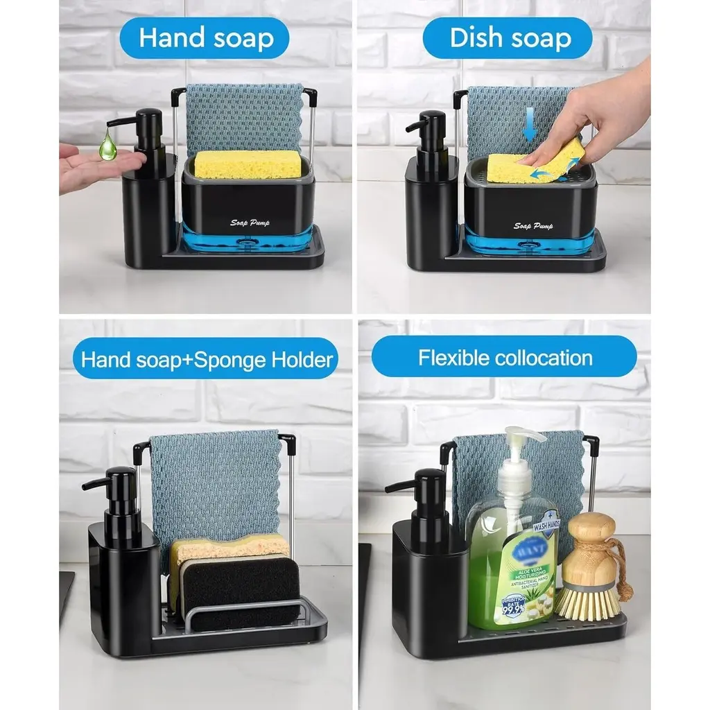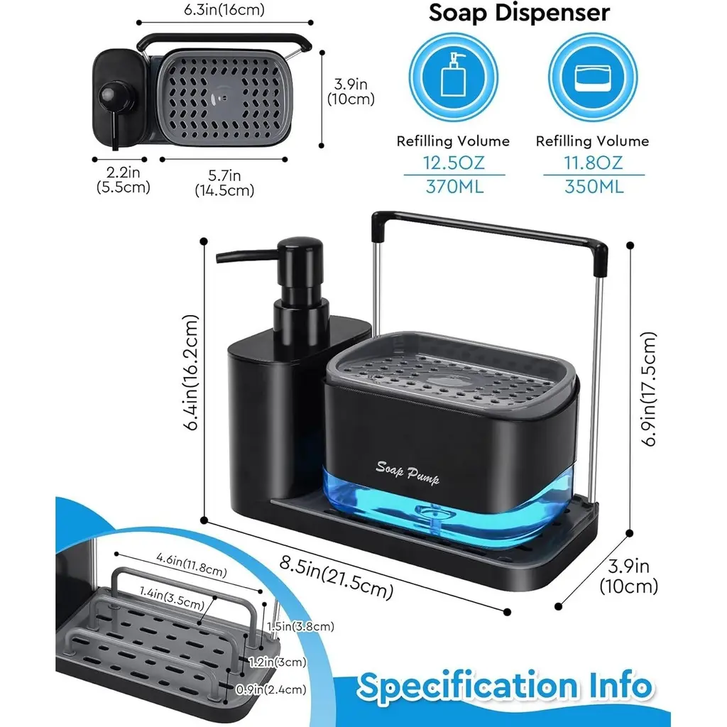 Premium & Safe Materials - Made from high-quality ABS + PC transparent material, this soap dispenser set is BPA-free, eco-friendly, and corrosion-resistant, ensuring long-lasting durability and safety for direct contact with liquids.Dual Soap Dispenser Design - Features two separate pump bottles, allowing you to conveniently store and distinguish between hand soap and dish soap, making kitchen cleaning more efficient.5-in-1 Multi-Functional Storage - Designed with a soap dispenser, drain tray, rag holder, and a separate sponge holder, this set helps keep your kitchen organized while ensuring quick drying of washcloths and sponges.Easy-to-Clean & Leak-Proof - The removable drain tray and sponge holder prevent water buildup and keep countertops dry. Simply detach and rinse for effortless maintenance, or place them in the dishwasher for a deeper clean.Modern & Space-Saving Design - With its sleek and practical structure, this soap dispenser set maximizes counter space while adding a stylish touch to any kitchen or bathroom.