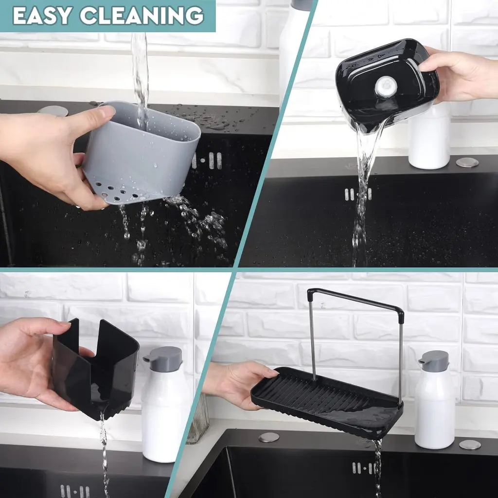 Premium & Safe Materials - Made from high-quality ABS + PC transparent material, this soap dispenser set is BPA-free, eco-friendly, and corrosion-resistant, ensuring long-lasting durability and safety for direct contact with liquids.Dual Soap Dispenser Design - Features two separate pump bottles, allowing you to conveniently store and distinguish between hand soap and dish soap, making kitchen cleaning more efficient.5-in-1 Multi-Functional Storage - Designed with a soap dispenser, drain tray, rag holder, and a separate sponge holder, this set helps keep your kitchen organized while ensuring quick drying of washcloths and sponges.Easy-to-Clean & Leak-Proof - The removable drain tray and sponge holder prevent water buildup and keep countertops dry. Simply detach and rinse for effortless maintenance, or place them in the dishwasher for a deeper clean.Modern & Space-Saving Design - With its sleek and practical structure, this soap dispenser set maximizes counter space while adding a stylish touch to any kitchen or bathroom.