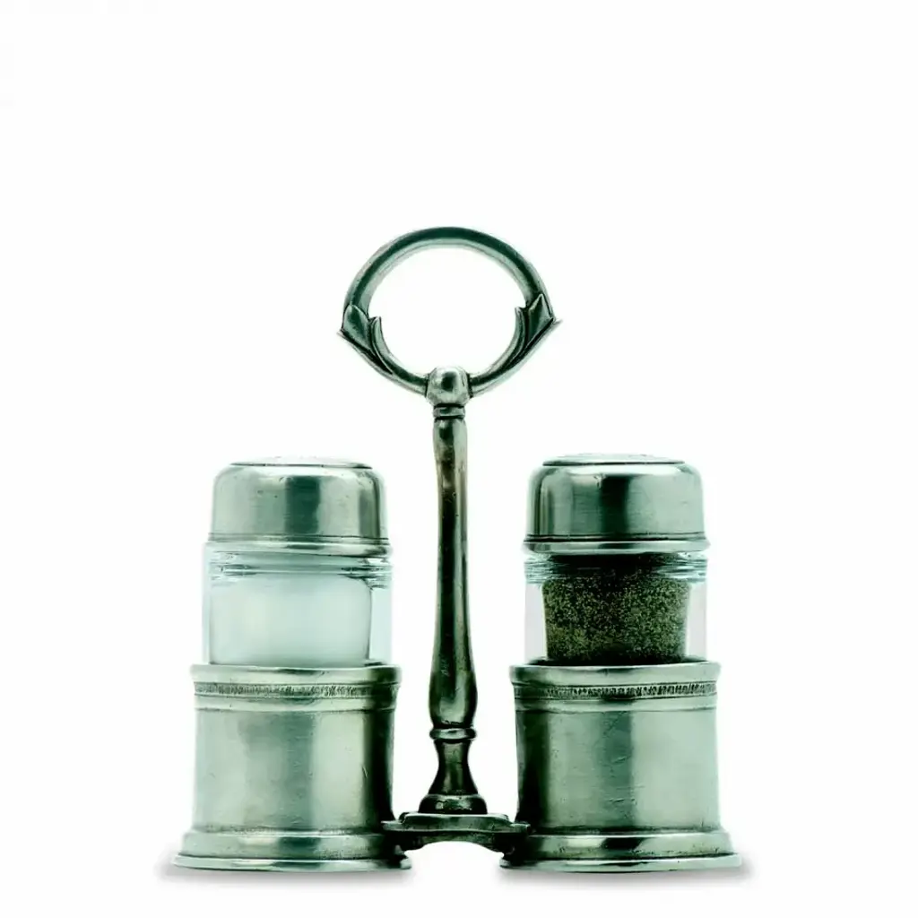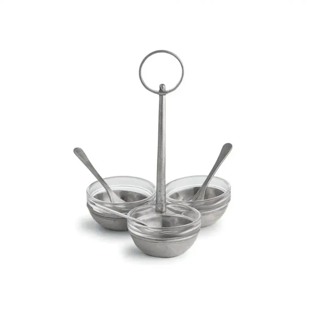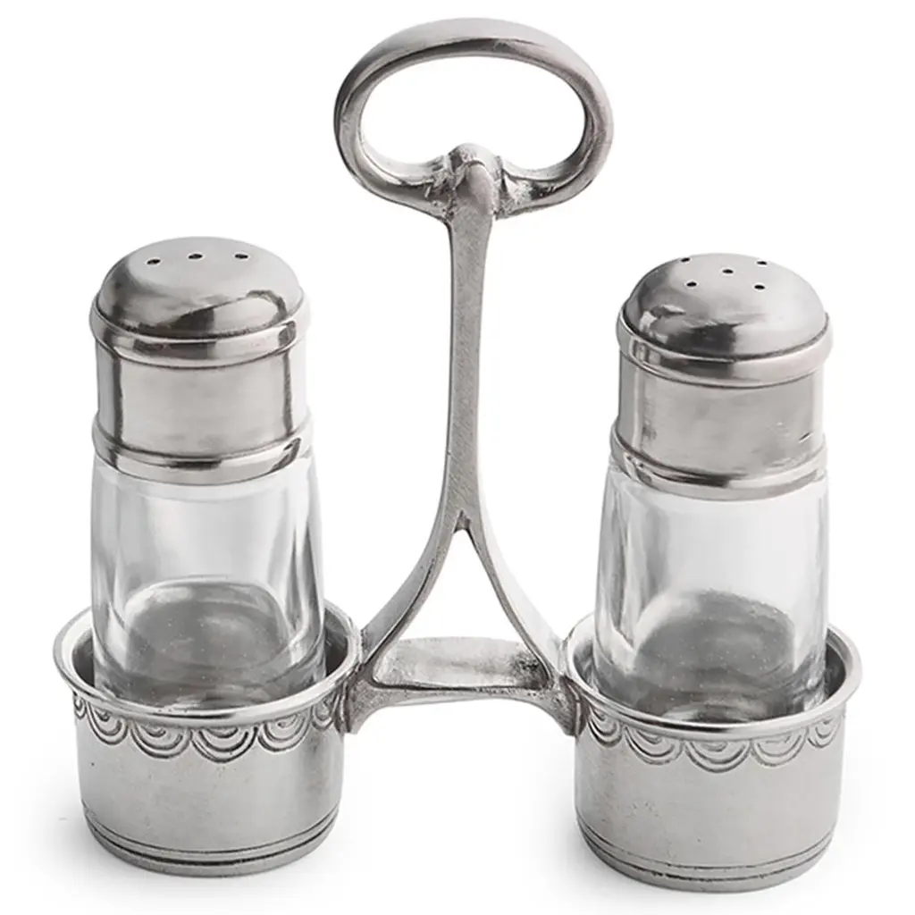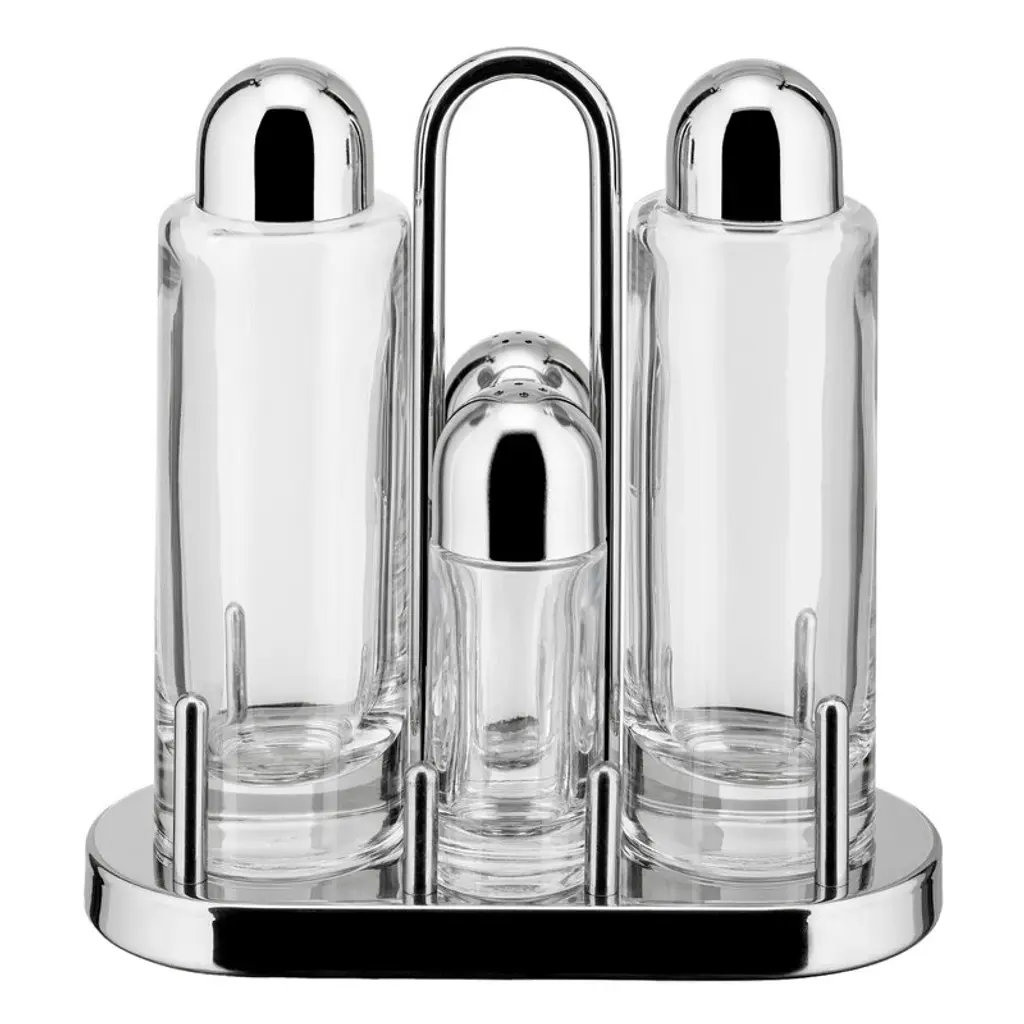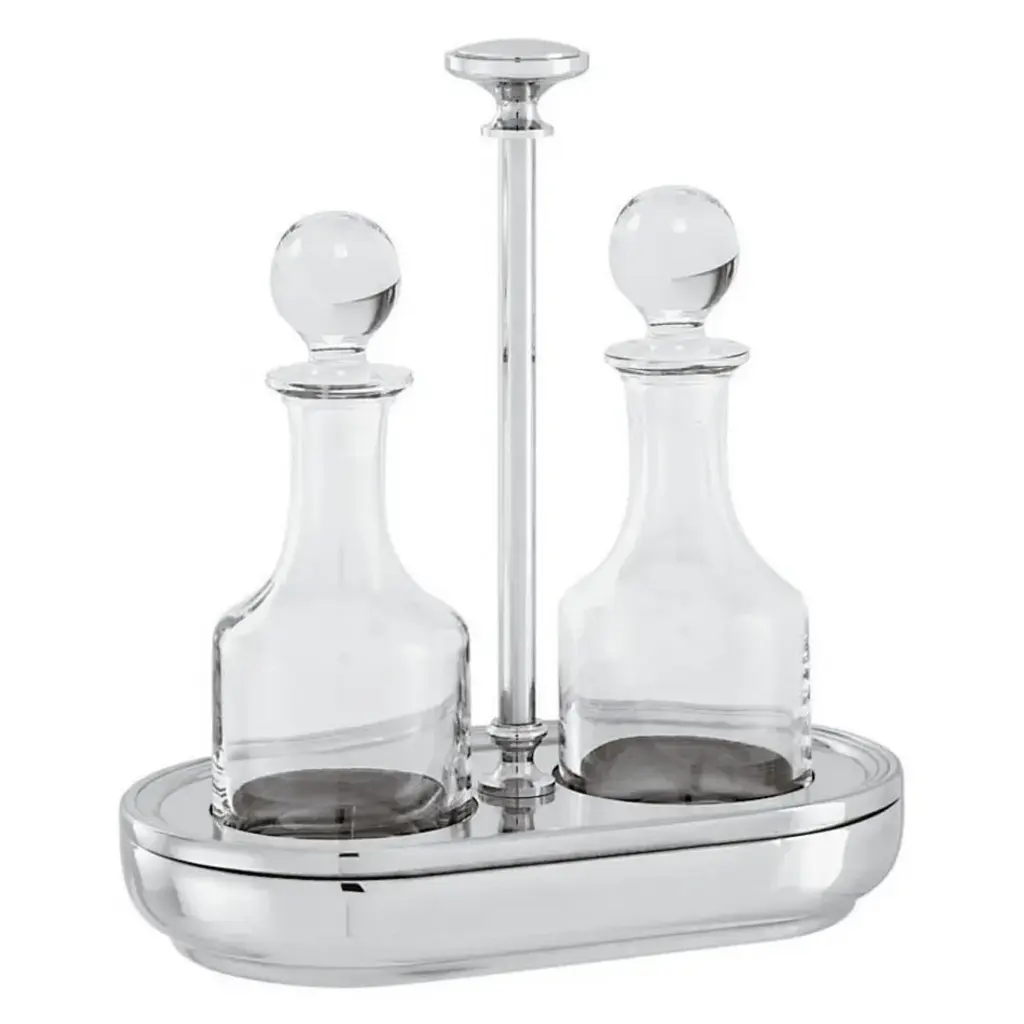 Simple and versatile, this six-piece serving set for condiments is a functional accessory that will add rustic charm and style to any counter and table setting. Fitted in a round wooden tray decorated with silver gray leather and rope trim around the border, this set includes salt and pepper shakers, oil and vinegar dispensers, a tall bottle, and a small airtight container, all made of glass with chrome-finished caps. The tray features a slim, ergonomic metal handle anchored in the center of the tray.