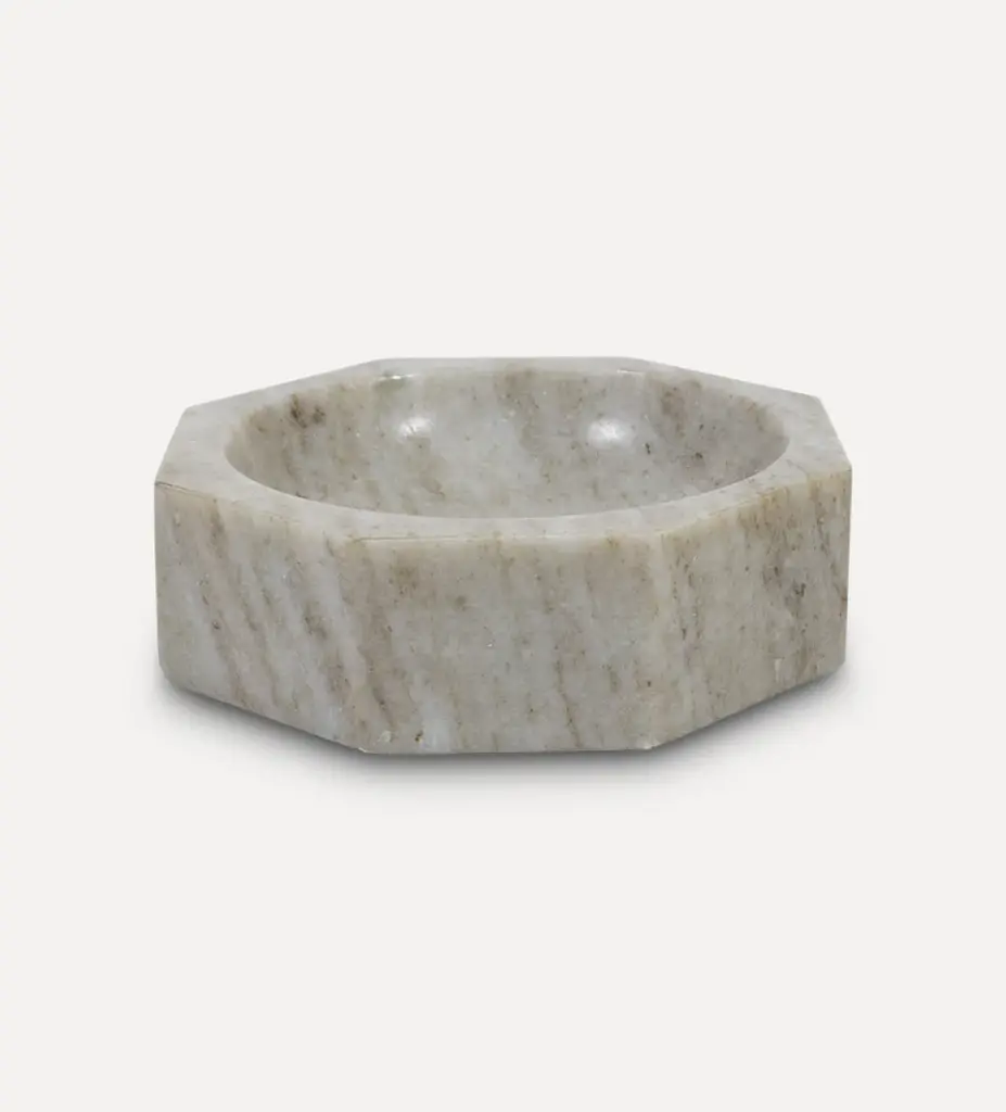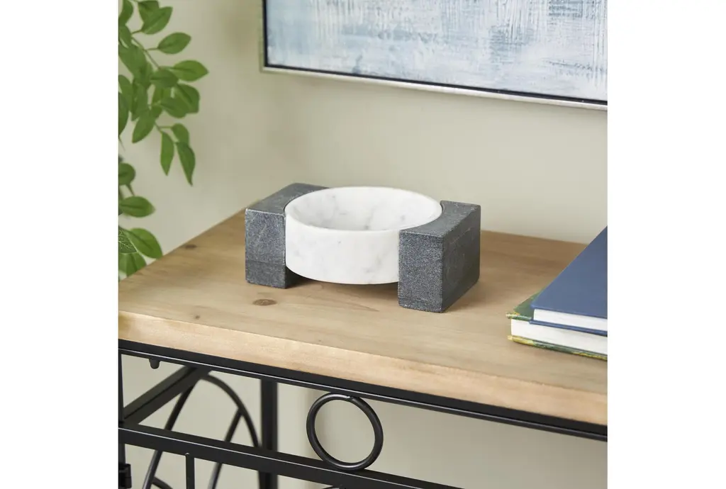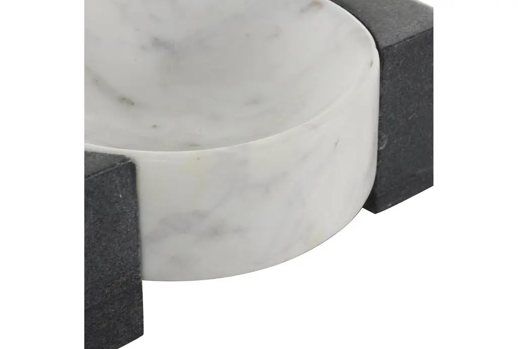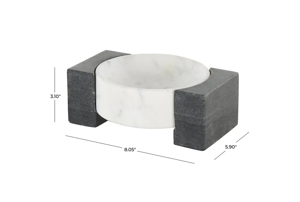 Enhance your living space with the 8" X 6" White Marble Geometric Round Tray with Black Rectangular Blocks. This tray combines sleek elegance and clean lines to offer effortless luxury with its monochromatic tones and bold, angular structures. Crafted from high-quality marble, it ensures durability and longevity while adding a modern and elegant touch to any setting.