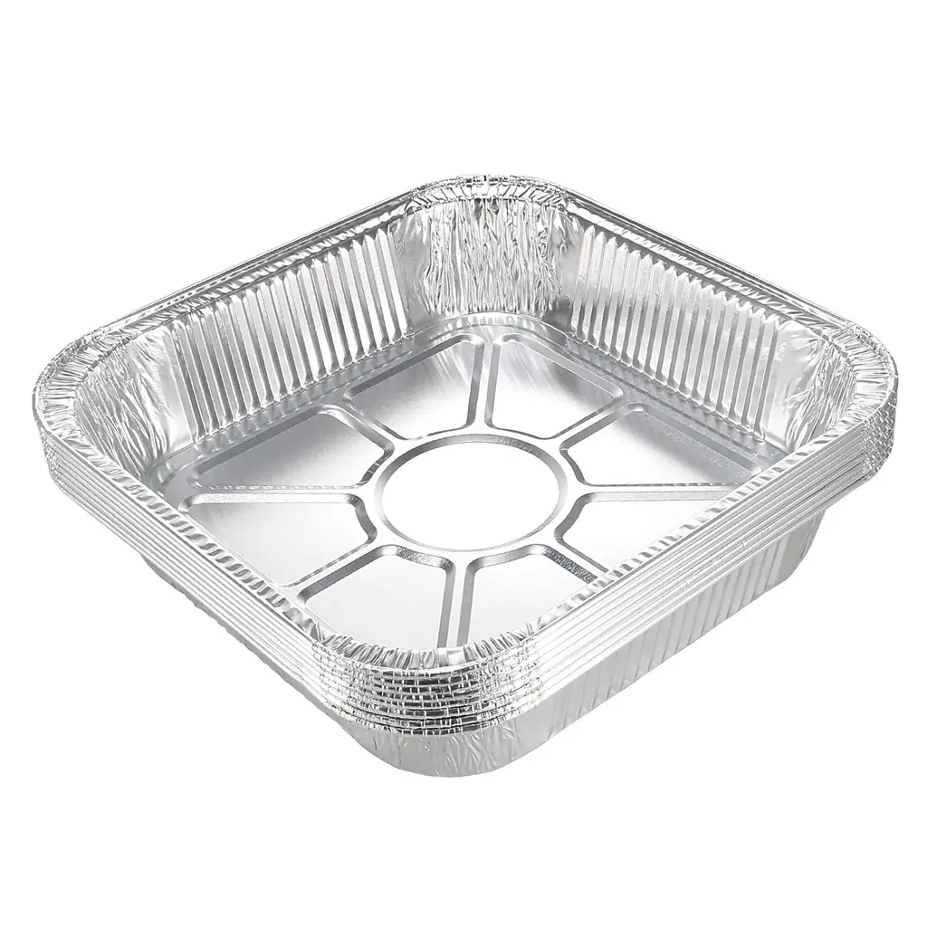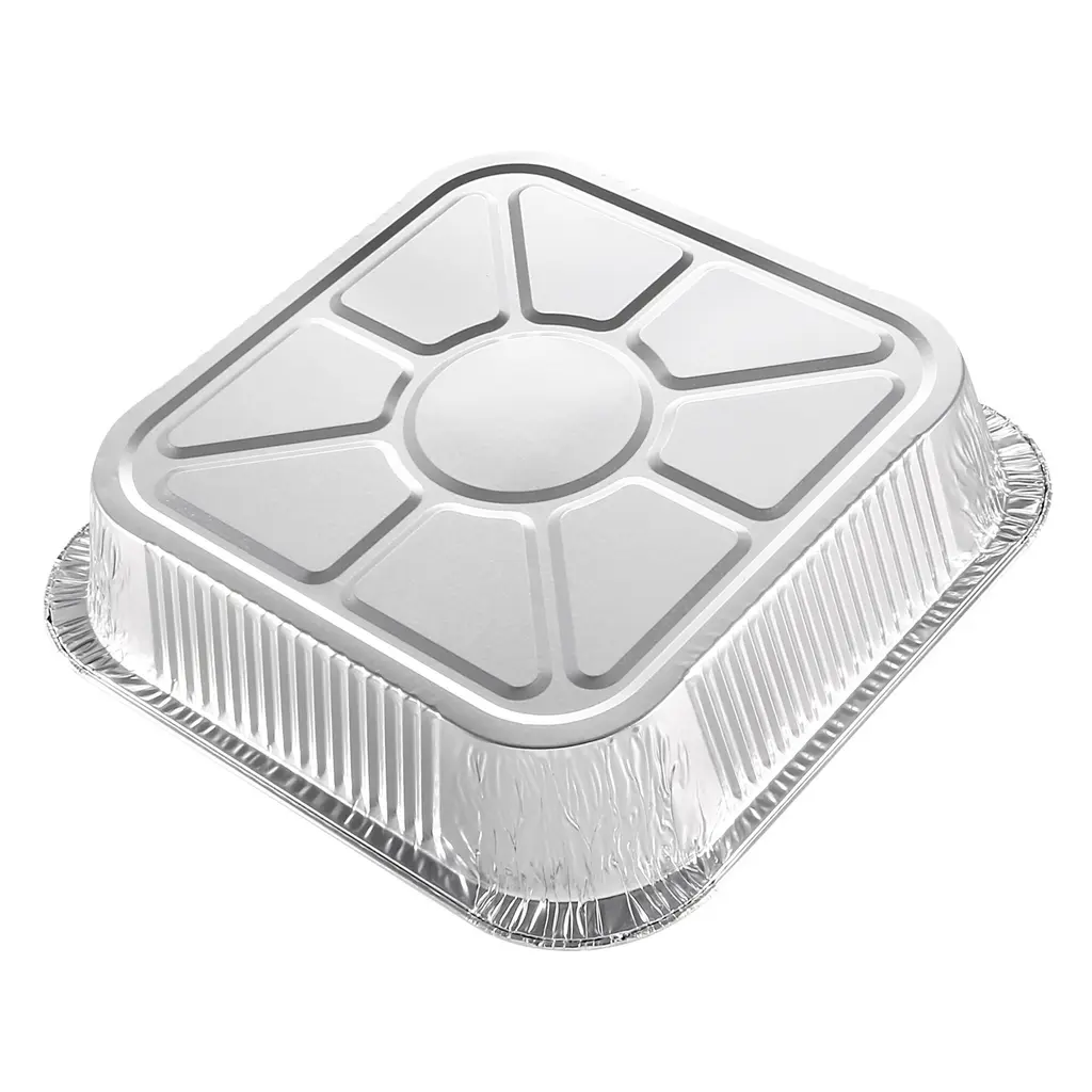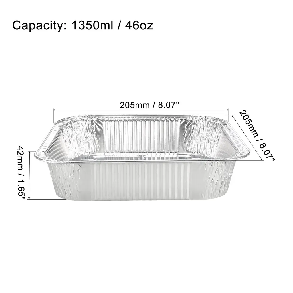 These 8" x 8" Aluminum Foil Pans are perfect for all your cooking and serving needs. With a capacity of 46oz (1350ml), these disposable trays are ideal for grilling, baking, roasting, cooking, reheating, storing, serving, buffets, and takeaways. Made from thick and sturdy aluminum foil, these pans won't collapse when filled with food, ensuring easy handling and serving. They can withstand temperatures up to 660 degrees centigrade, allowing for even heating and enhancing the taste of your food. Whether you're handling pizza, cupcakes, tarts, pies, cookies, bread, and more, these silver foil pans are a convenient and versatile option.Features:Specification:
