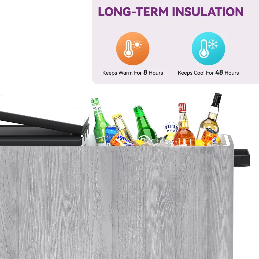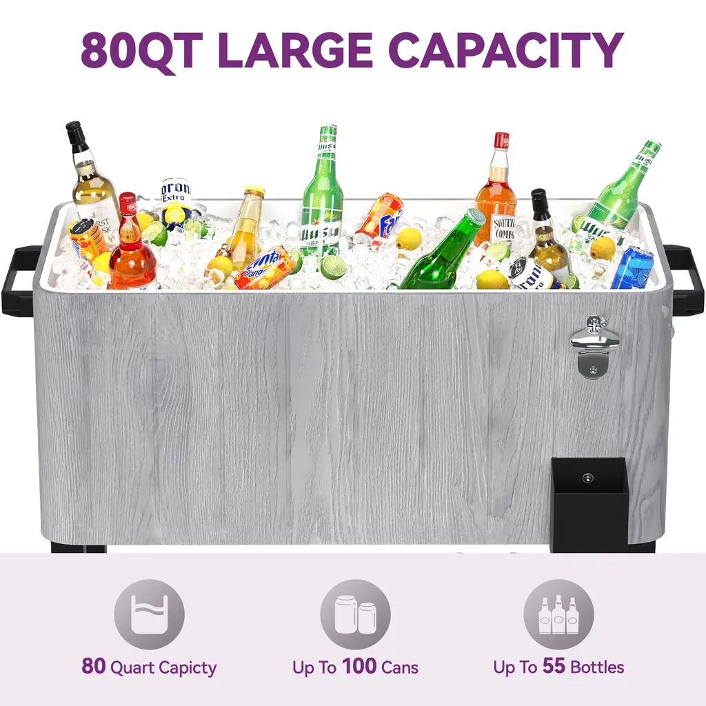 Enjoy our remarkable patio cooler with an impressive 80-quart capacity. It can store over 100 cans or 55+ bottles and keep them cool for up to 48 hours or warm for up to 8 hours. Perfect for any outdoor gathering or event, it conveniently chills a generous selection of beverages. The cooler features 360° swivel, lockable wheels for effortless rolling in any direction. Equipped with ergonomic handles on both sides, it ensures easy mobility and hassle-free transportation. The bottom tray provides extra storage space, and the attached bottle opener with cap catcher adds convenience. With a vintage wooden texture finish, our portable cooler cart exudes timeless charm and sophistication, elevating any setting.