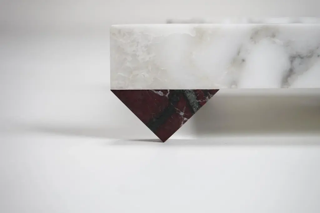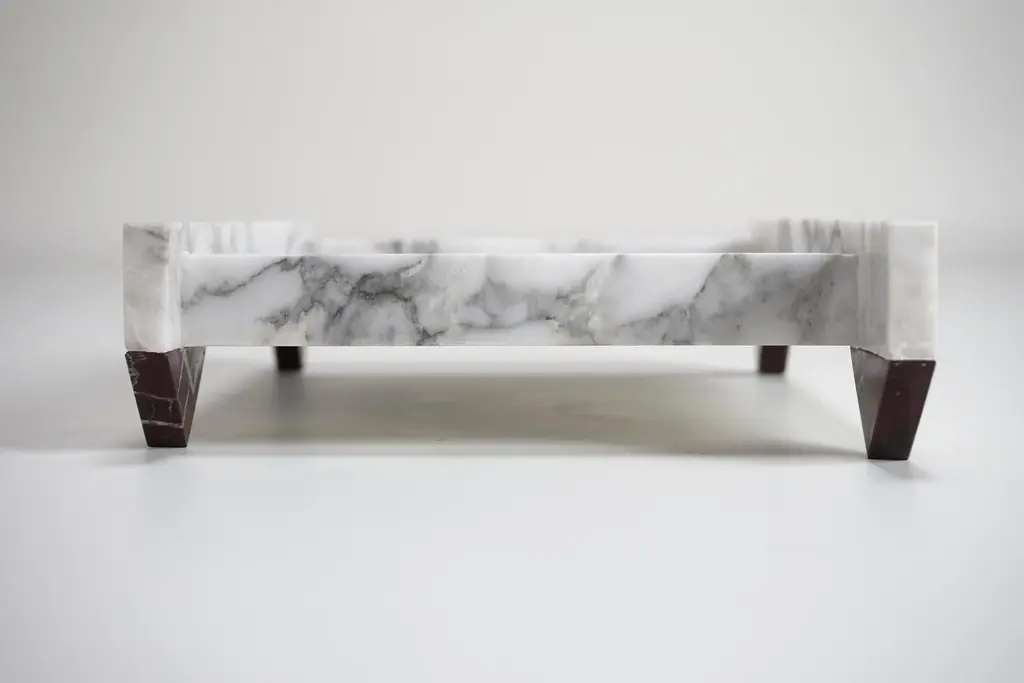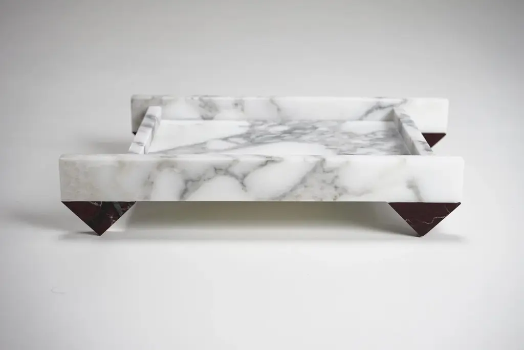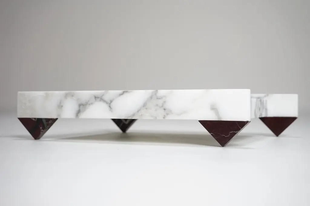 With its simple sculptural form and sharp geometry, the “90°” tray is exceptionally crafted for a wide range of settings. The design responds to multifunctional purposes. The sculptural and playful composition of 90° angles ties together the unique characteristics of Red Lepanto and Arabescato corchia marble, through form and refined detailing. Labeled by Maker