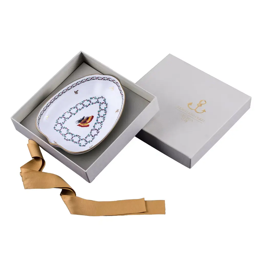 Exquisite craftsmanship and luxurious details finely painted by hand define the unique, lobed aesthetic of this tray, a popular design in the 18th century among Venetian nobility. A subtle oriental inspiration imbues the piece, showcasing a vibrant butterfly encircled by wreaths of leaves and berries, gold plant-like details further adorning the border sealed by a matching luminous rim. The tray comes packed in a precious gift box.