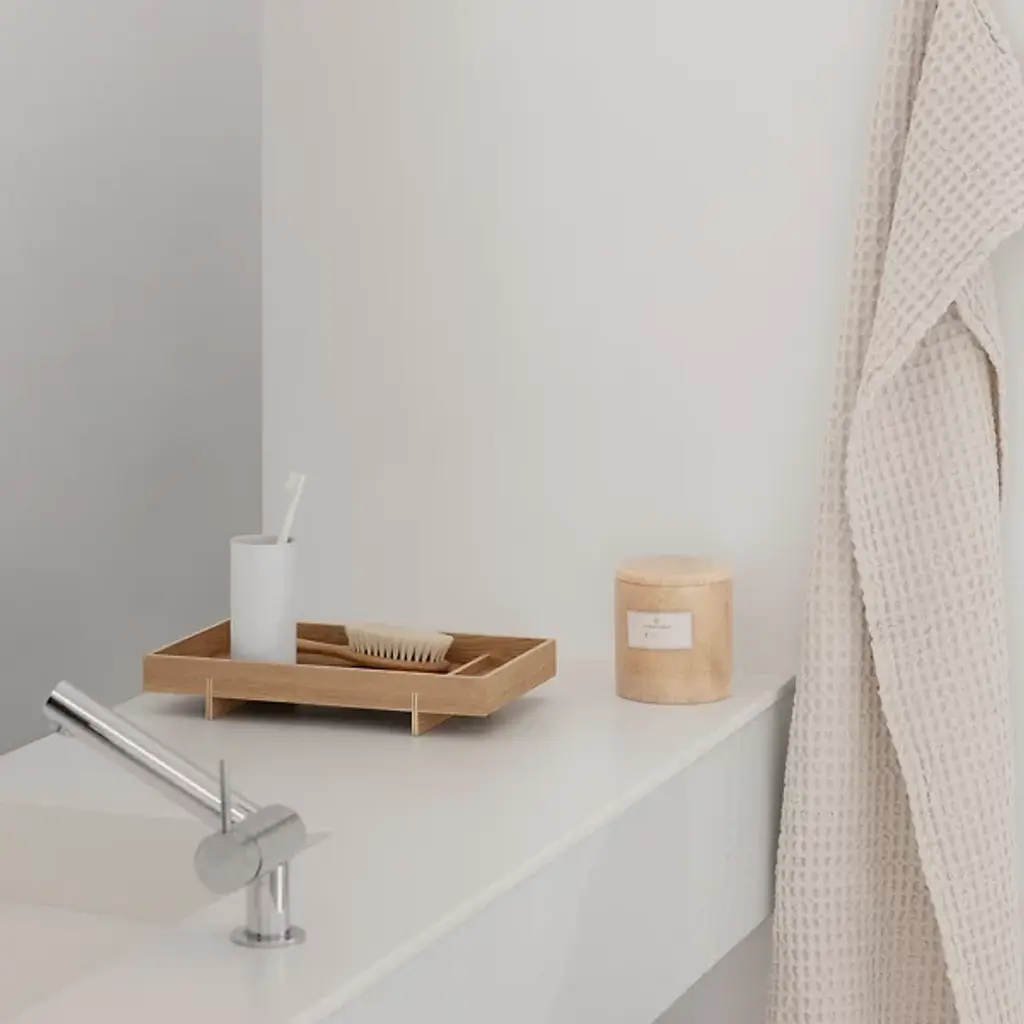Add a touch of organic beauty to your daily routine with the ABENTO Hardwood Tray from Blomus. It’s an elegant, natural complement to the wall-mounted shelf by Blomus. The piece slots right in with a low-profile rectangular shape. It’s crafted from oak wood, presenting a surface brimming with organic grain and texture. The oak wood is split into an array of pieces, creating a separated composition best suited for soap and other toiletries. The oak wood is an enduring material brought in to withstand corrosion.