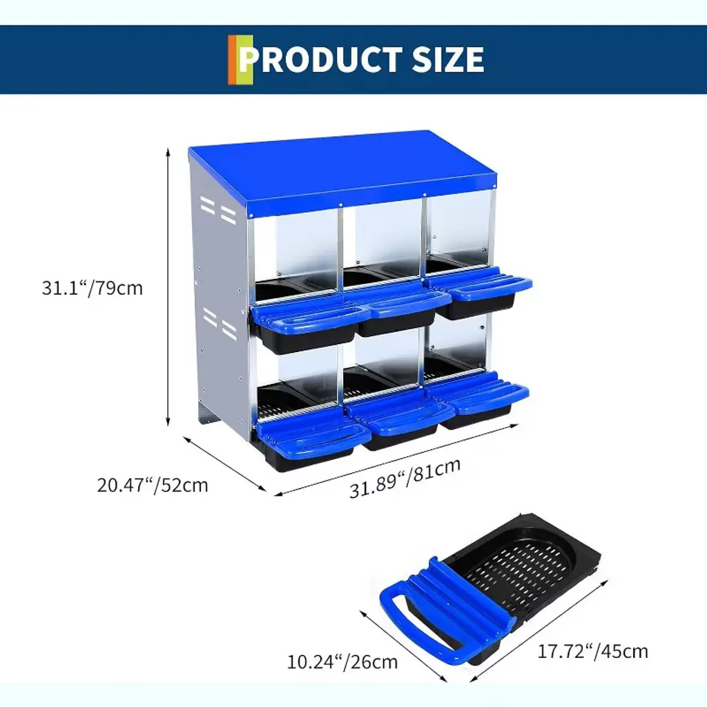 The Acekool Chicken Nesting Box is made to give your hens a quiet, comfortable space for laying eggs and to make egg collection simple for you. With six roomy nest holes arranged in two layers, every hen can find her spot, helping reduce stress and support healthy egg production. The structure is designed to fit coops, barns, or backyard setups. A gentle slope in each nest directs eggs into a roll-away tray, keeping eggs clean and out of reach until you’re ready to collect. Galvanized steel with vent holes helps keep the inside dry and fresh, while removable plastic trays make cleaning fast. This setup helps reduce odors and keeps your hens in a healthy, dry space. The whole nest measures and fits most standard coops or sheds. Each tier and tray is sized for standard chickens and eggs. The legs provide stability, while included hardware ensures quick assembly and easy mounting. With Acekool, keeping your flock comfortable and your eggs clean is simple and reliable—making backyard poultry care easier every day.