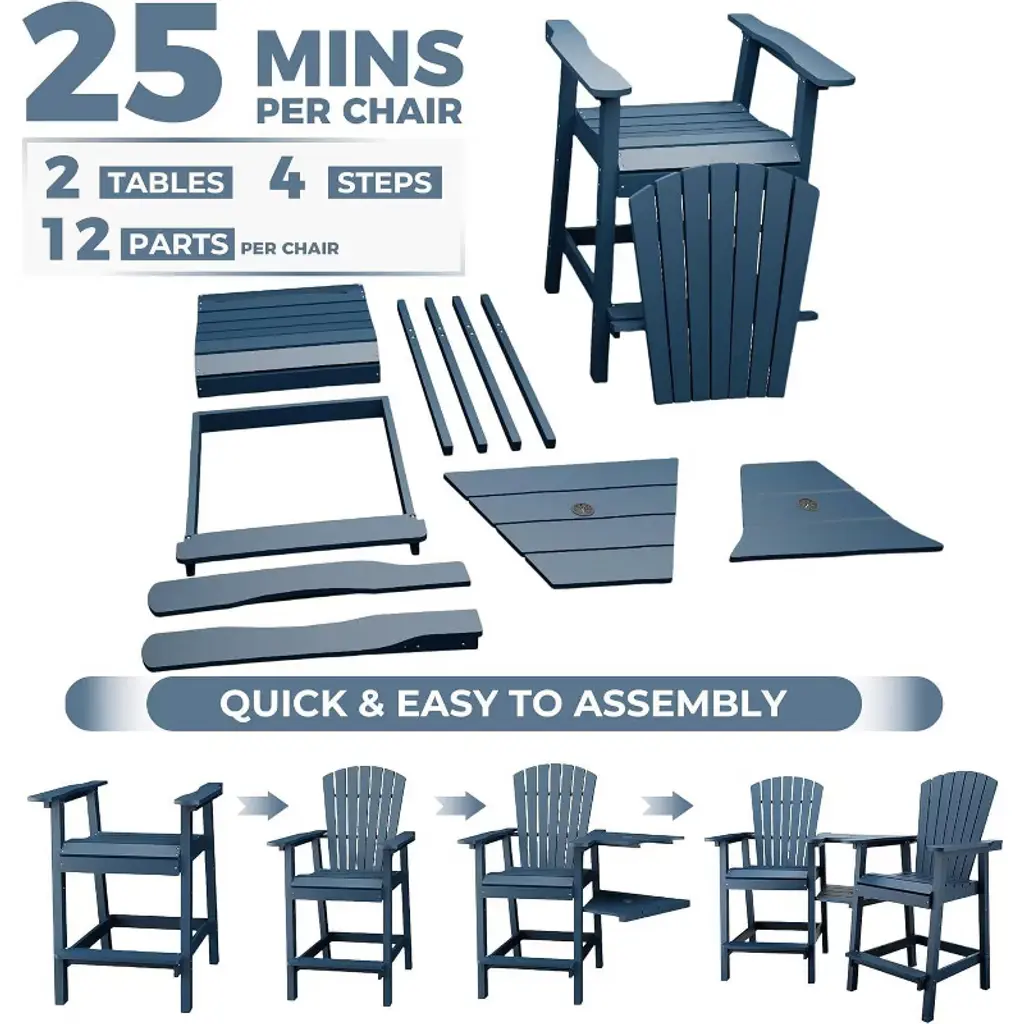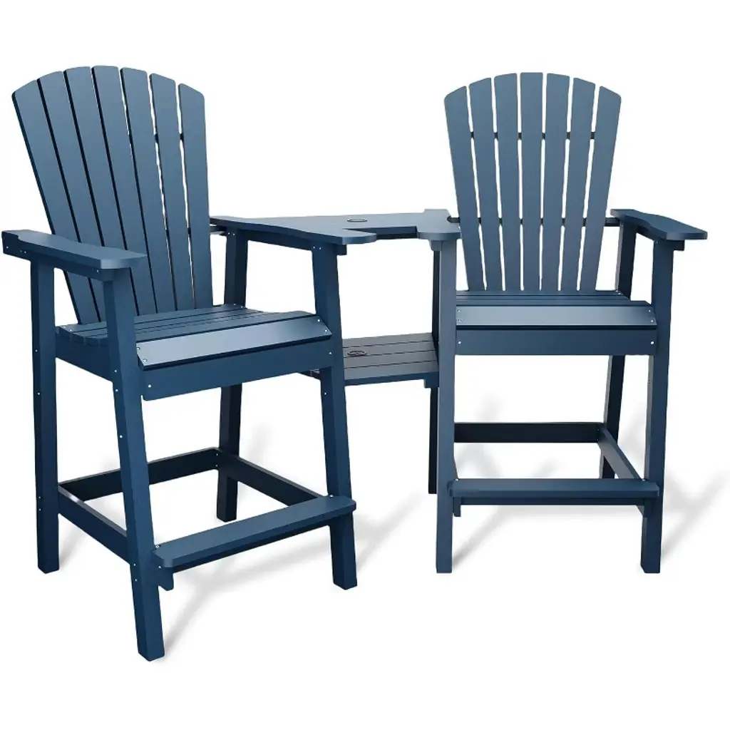 The Acekool Recycled Poly Adirondack Barstools bring comfortable, eco-friendly seating to outdoor spaces. Made from durable recycled materials, these chairs handle all weather while keeping their clean look. The connecting tray makes them perfect for friends to share drinks and snacks. Each chair provides excellent back support with its ergonomic shape. The sturdy HDPE plastic stands up to seasons of use without maintenance. At bar height, they create a great spot for socializing or relaxing with a view. Set includes two 27.6"L x 28.3"W x 51"H chairs that fit most outdoor areas. The simple assembly and low-maintenance design let you enjoy your patio, deck or balcony right away. Dimensions: Each Chair: 27.6"L x 28.3"W x 51"H Seat Height: 28" Footrest: 3.1" wide Weight Capacity: 350 lbs per chair Tray Capacity: 35 lbs Material: Recycled HDPE plastic Set Includes: 2 chairs + connecting tray