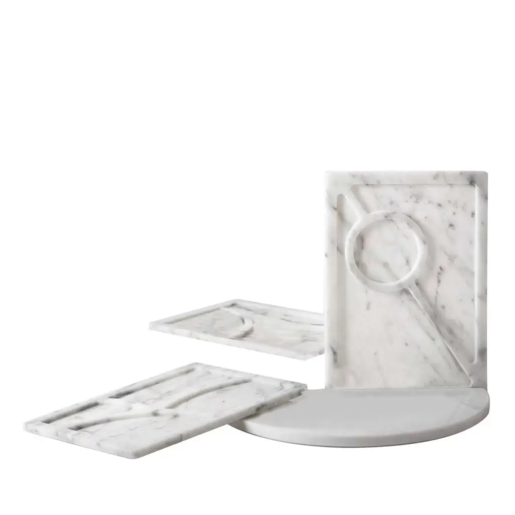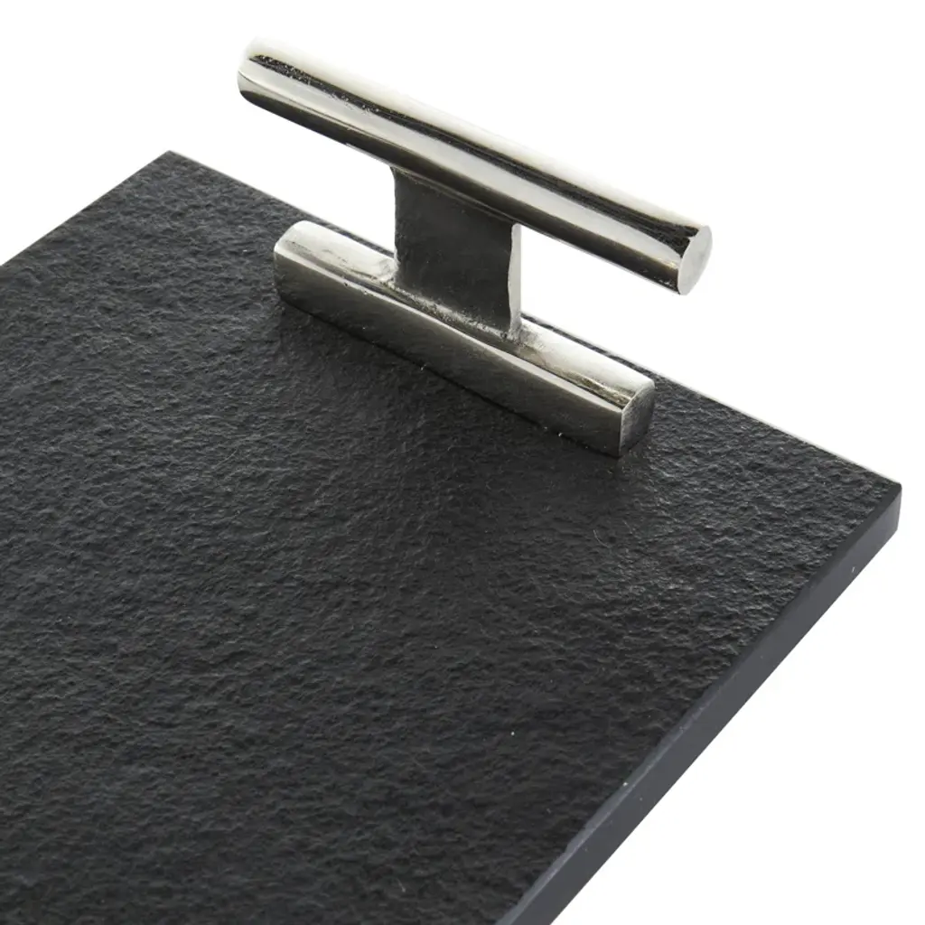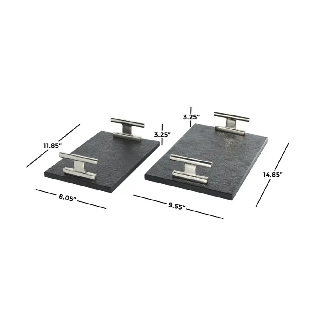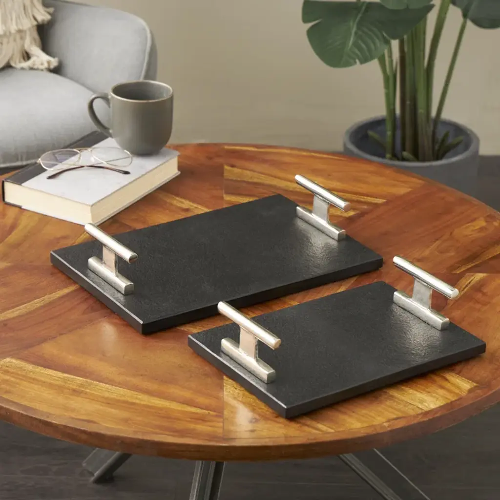 A set of 2 decorative trays that can be used as a stylish centerpiece on a coffee table or dining table, where it can hold candles, flowers, or other small decor items. This black-colored ottoman tray comes as a set of 2. Modern style.