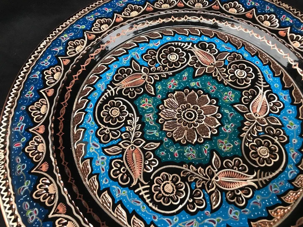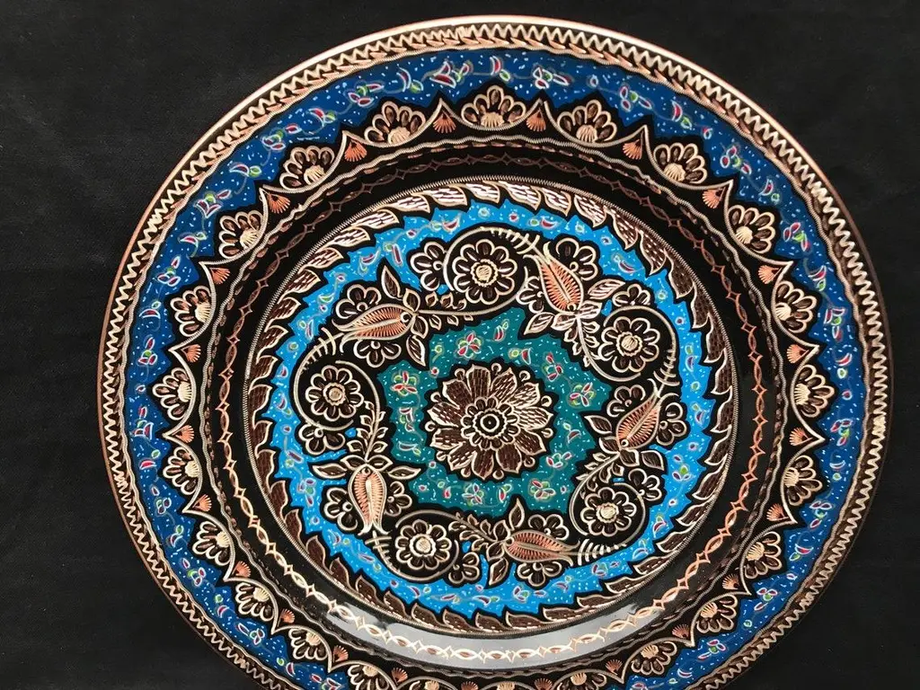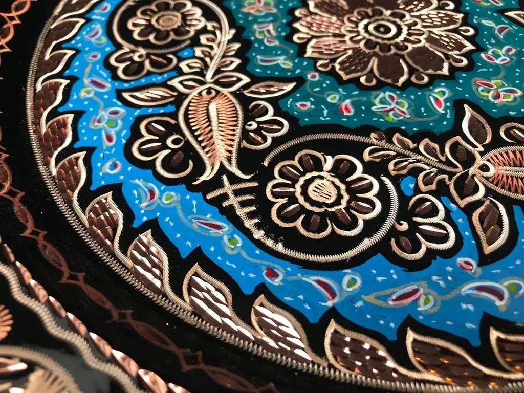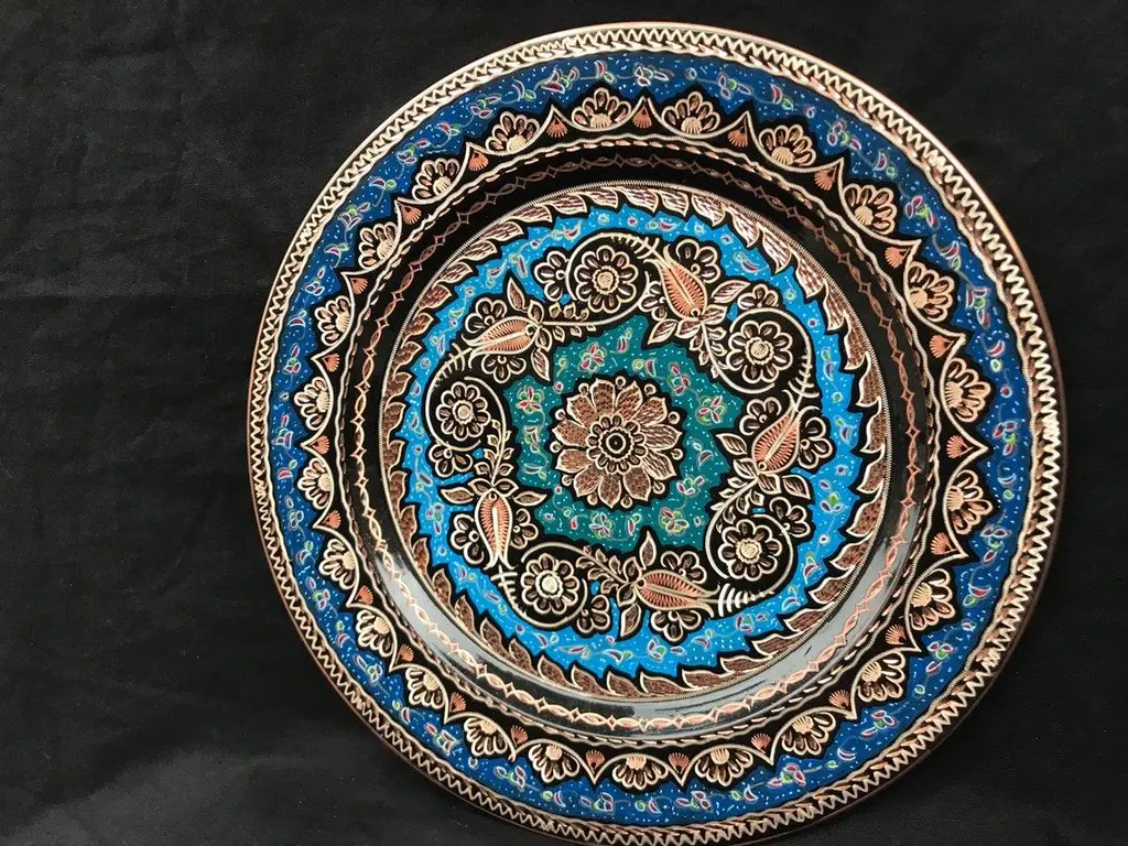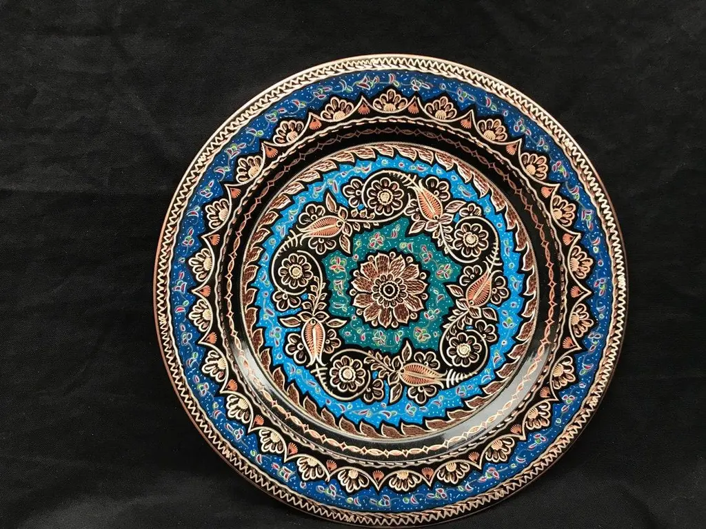 Aesthetic boho wall hang plate \.service tray made by copper. Colorful design for wall. Great for displaying your unique decoration. Hand painted plates can be hung to create wonderful wall art. There is an insert on the back of the plate for hanging. SIZE: 43 CM / 17 INCH My items are all unique and one of a kind. You can wash my items with your hand and you need to dry it properly. All hand painted, hand carved, varnished and waterproof.
