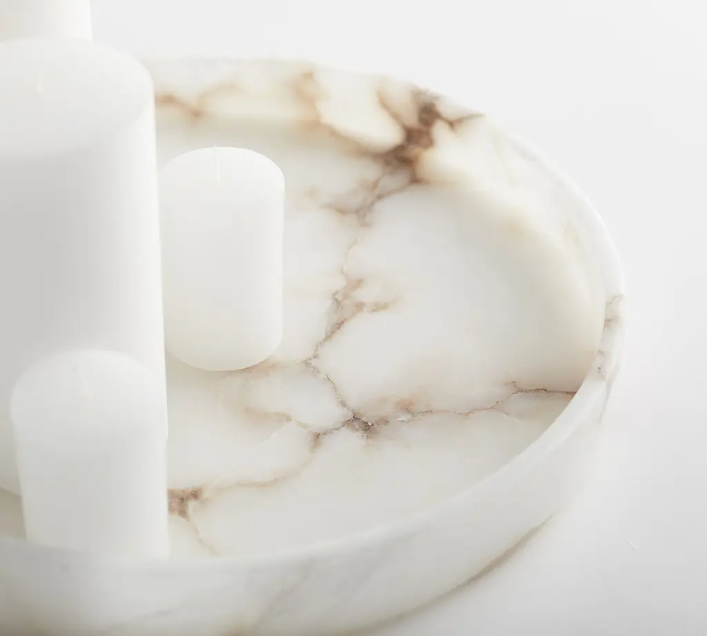 Expertly hand carved from a single piece of Portuguese alabaster, this tray lends a chic, organic look to your bath or bedroom. A footed base and low rim display and contain its contents, from candles and trinkets to perfume and tissues. The hand-polished finish accentuates natural tonal variations, making each piece one-of-a-kind.
