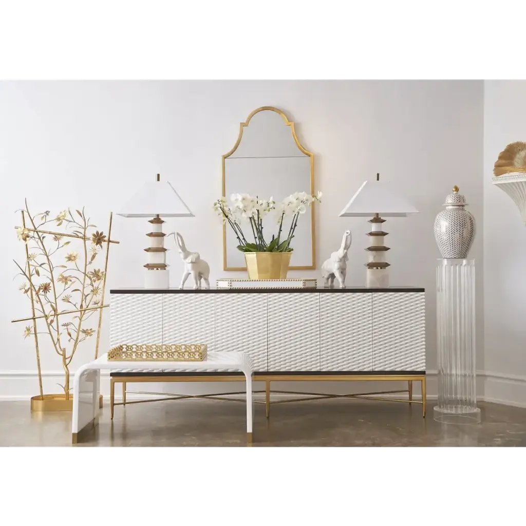 The Alexis Tray pays homage to the jewelry of the art deco era with its interlocking chain pattern resembling a beautiful bracelet. The tray bottom features glass with gold. Constructed of wood and glass and finished in satin gold, this tray is stylish and practical for entertaining or decorative use. Designed by Shayla Copas.