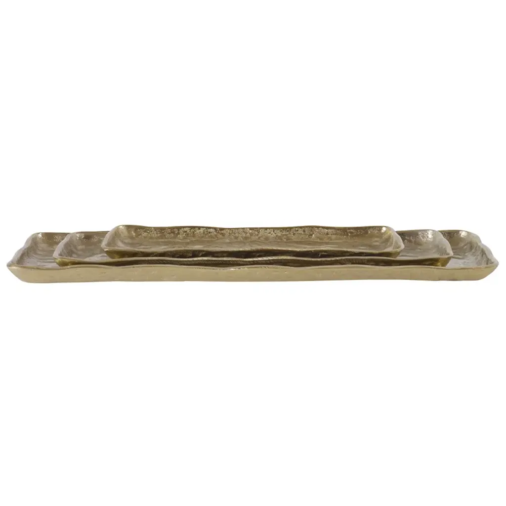 Arriving as a 3-piece set, this serving tray lends plenty of rustic glam style to coffee tables and consoles. Its rectangular silhouette features an organic edge, and the textured surface is coated in an antique gold finish for that extra bit of shine we love. Though it's made from aluminum, it still shows off more of a lodge feel than industrial. Bonus: Each tray in this trio is a different size, allowing you to carry variously sized items from room to room.