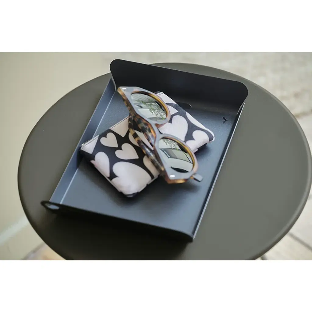 The tray 9x7 is made from 100% folded sheet steel. This tray combines strength and sophistication, providing a compact format that seamlessly complements existing trays or stands beautifully on its own. Its versatile design serves multiple purposes, making it ideal for various occasions. Use it to serve coffee to guests, enjoy a romantic breakfast in bed, or as a chic storage solution for your cherished jewelry pieces.