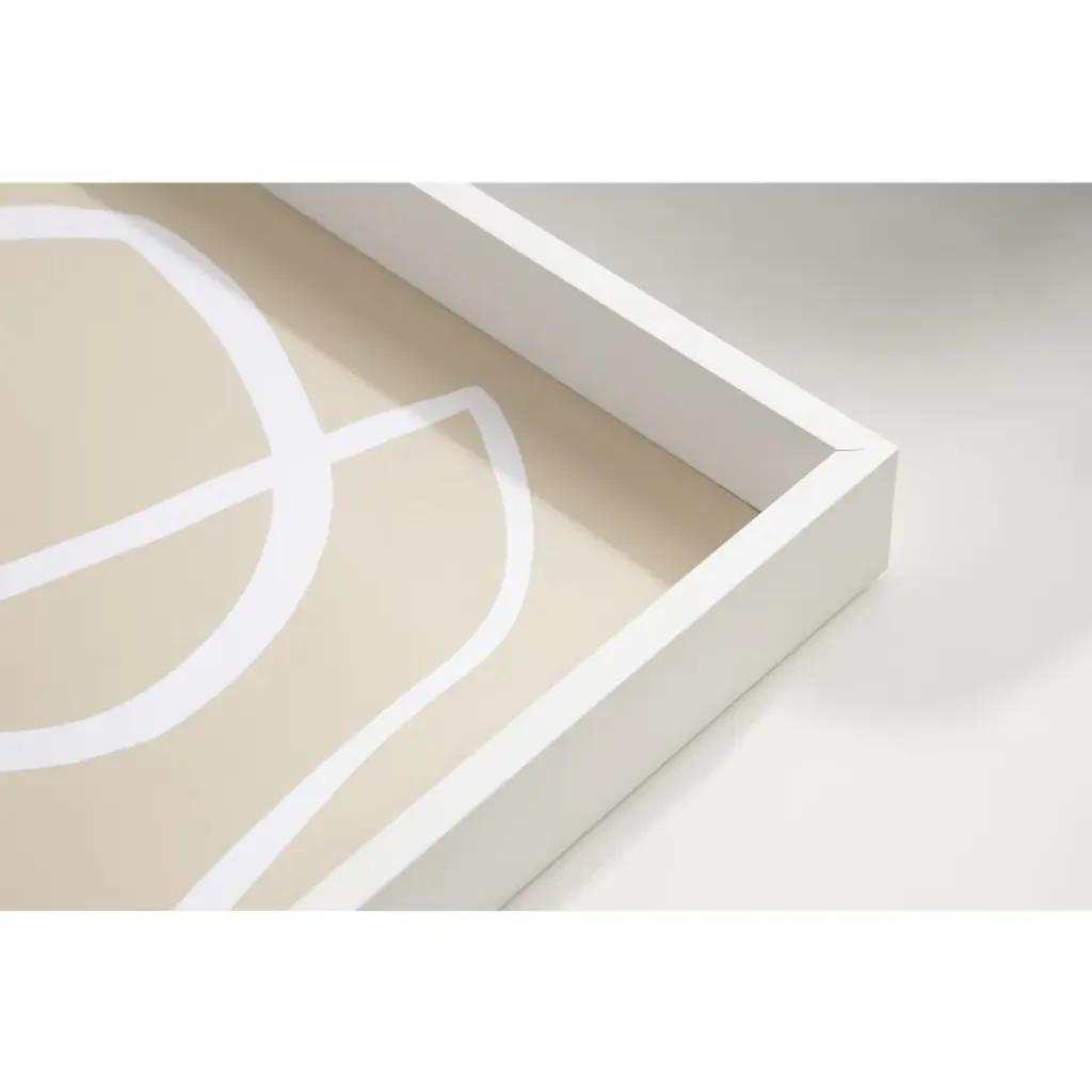 A playful white line gambols and twists into three overlapping circles atop a beige backdrop in this neutral abstract. This Amanti Art Decorative Wood Tray 13"x19" featuring 'Beige Lines III' by 1x Studio decorative tray brings both color and function to collect, display or organize items. High-quality printing is a stylish backdrop, while the protective coating, recessed back and black felt bumper pads make it easy to use. Not intended for outdoor use or heavy carrying.