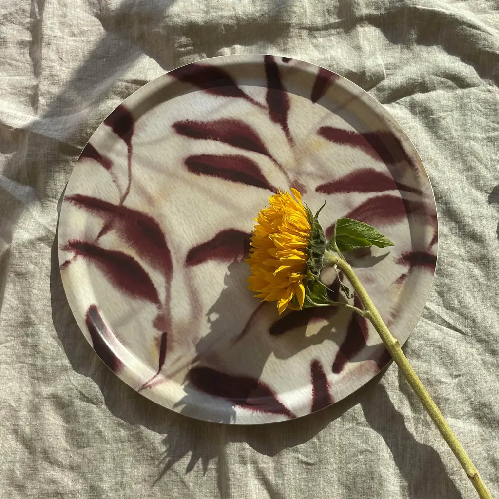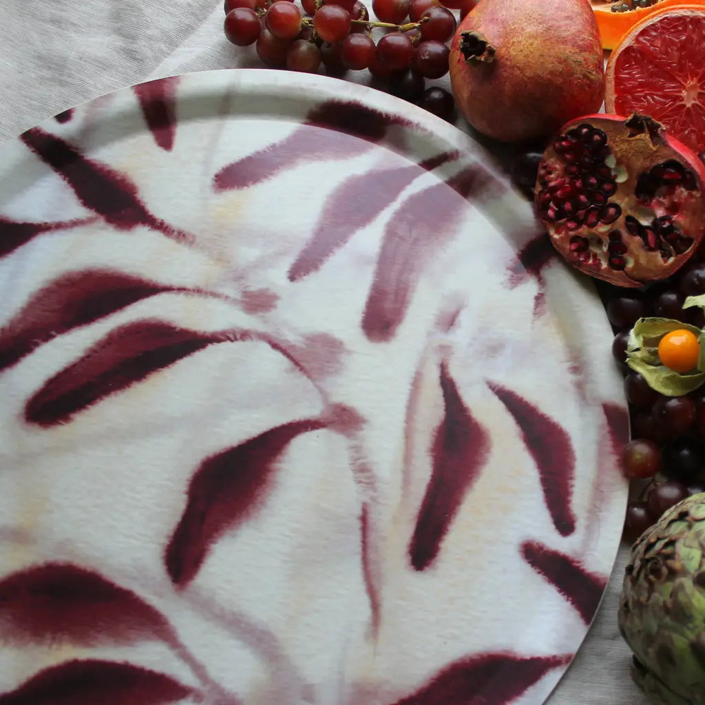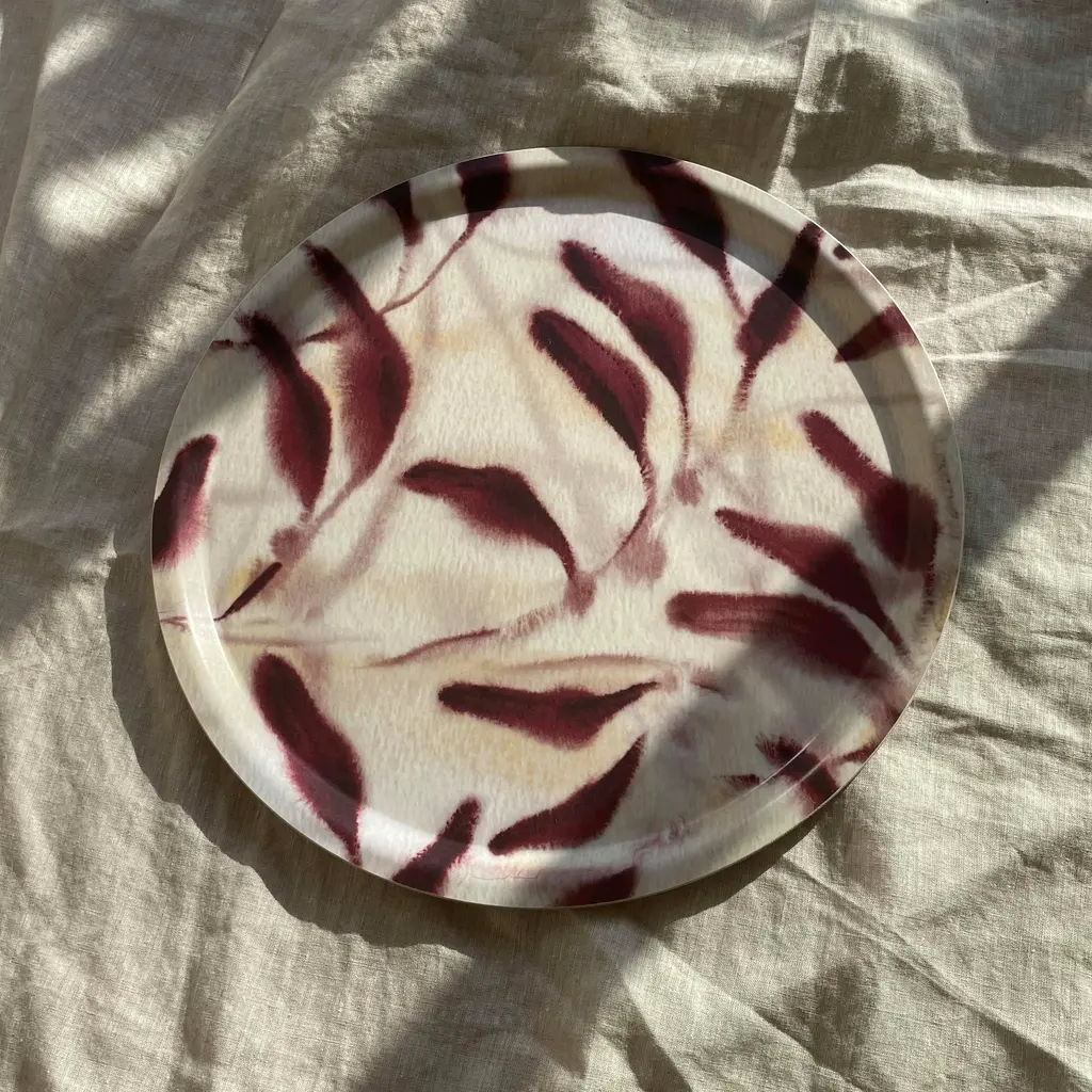 This Amongst round wooden tray in Red features a gorgeous, botanical leaf design, originally hand painted by Rosanna Corfe in her London home studio. This medium sized, circular, tray will be perfect as a serving tray for your favourite drinks at your next party or place with a vase and scented candle for a quick and simple way to display your favourite accessories and style your coffee or console table.