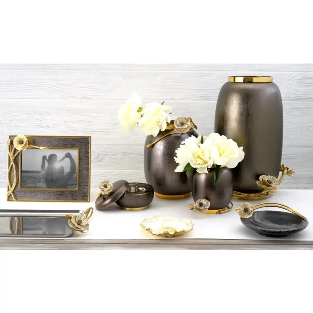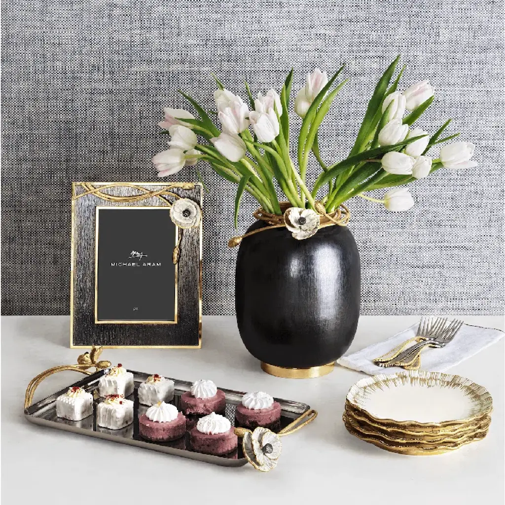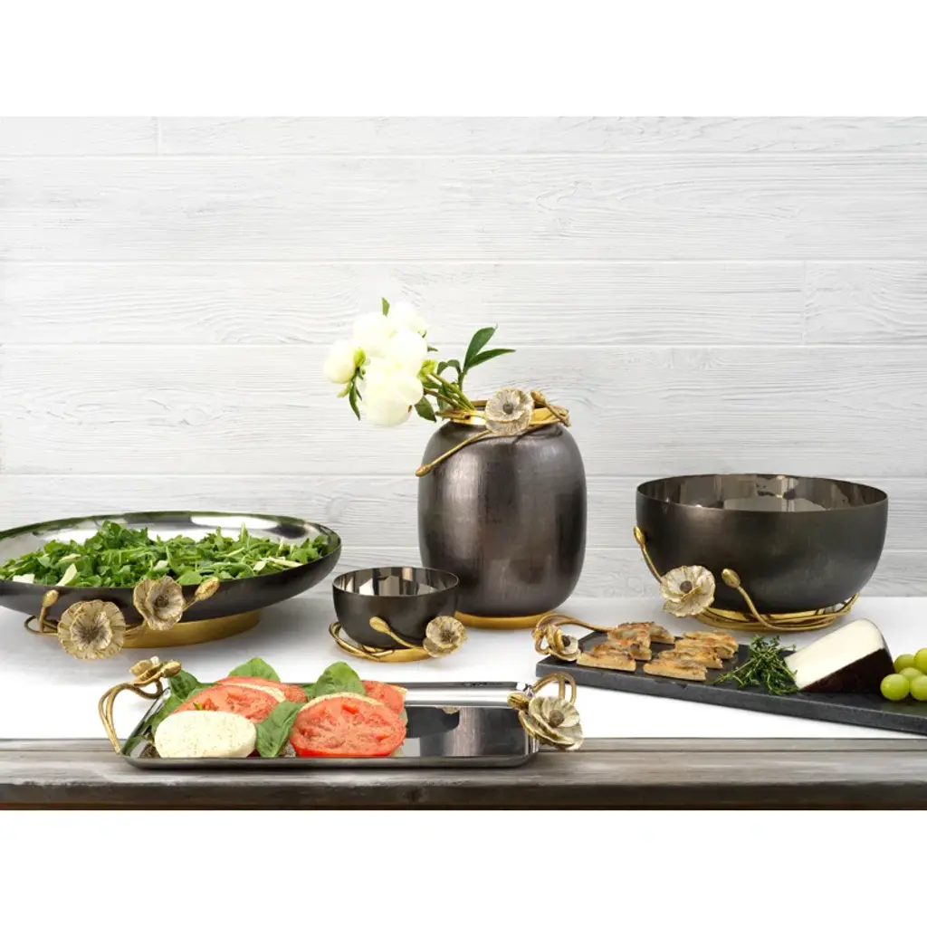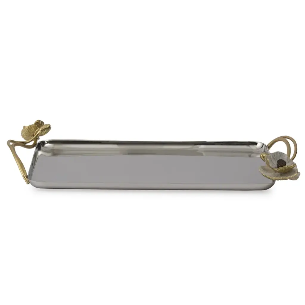 Footed clear glass tray with pewter floral patterned handles, inspired by the beautiful Rugosa Rose. Hand-set clear European crystals. Hand-wash only. Tarnish resistant. Signature luxury gift box included.