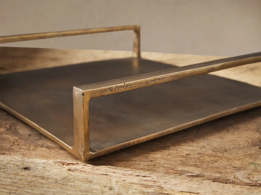 Crafted from aluminum in an antique brass finish, our Angelo Tray is perfectly sized for coffee tables, bringing rustic beauty to everyday moments. Tray and handles are crafted from aluminum in an antique brass finish. For decorative use only (not food safe).