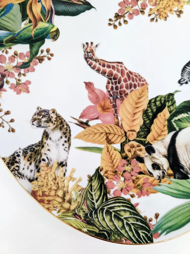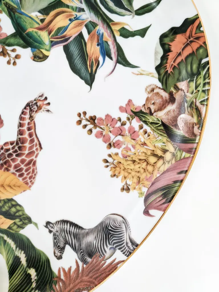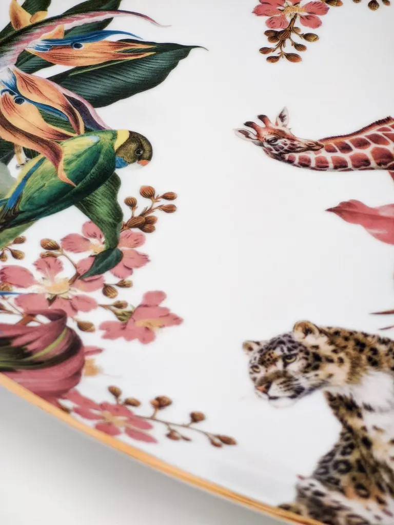 This 28x38cm oval tray is part of Animalia collection by Grand Tour by Vito Nesta. The classic and versatile shape is a must-have inside any home to embellish a table or beautify a wall. The rich design of tropical flowers hides several peeping animals.