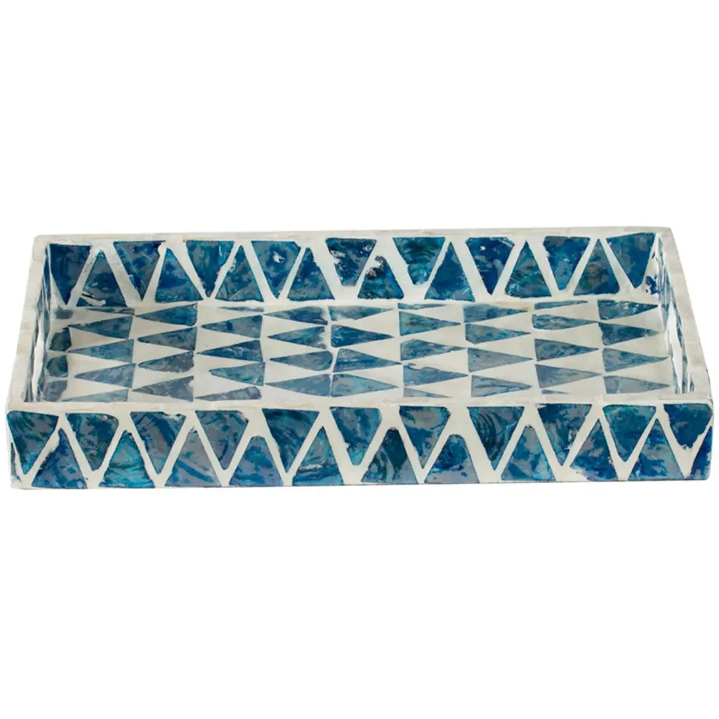 A small, decorative tray comes resplendent with a mosaic with pearl blue and white tiles arranged in a triangle pattern. It comes with side handles on each side for easy carrying. Decorate a coffee table or side table with this illustrious tray and let it complement your decor with its whimsical style.