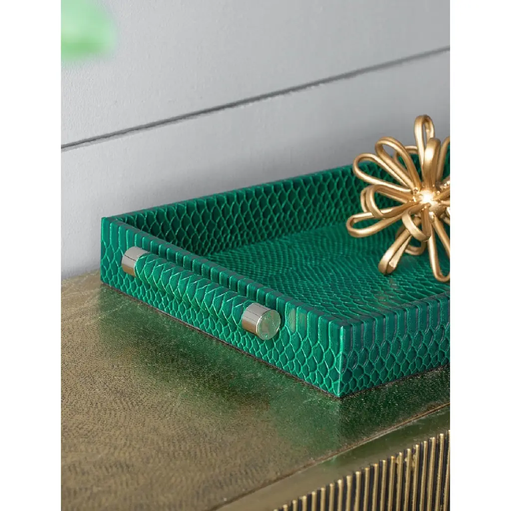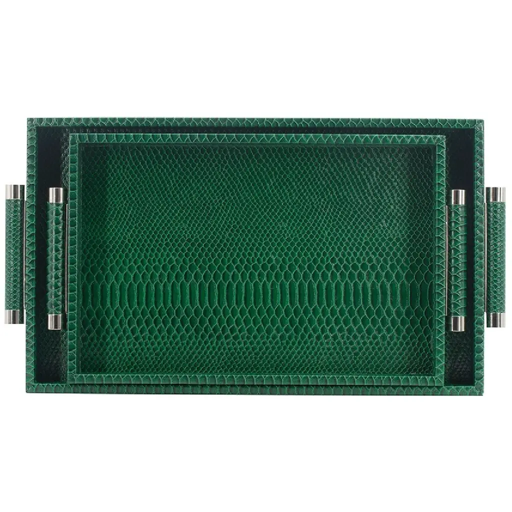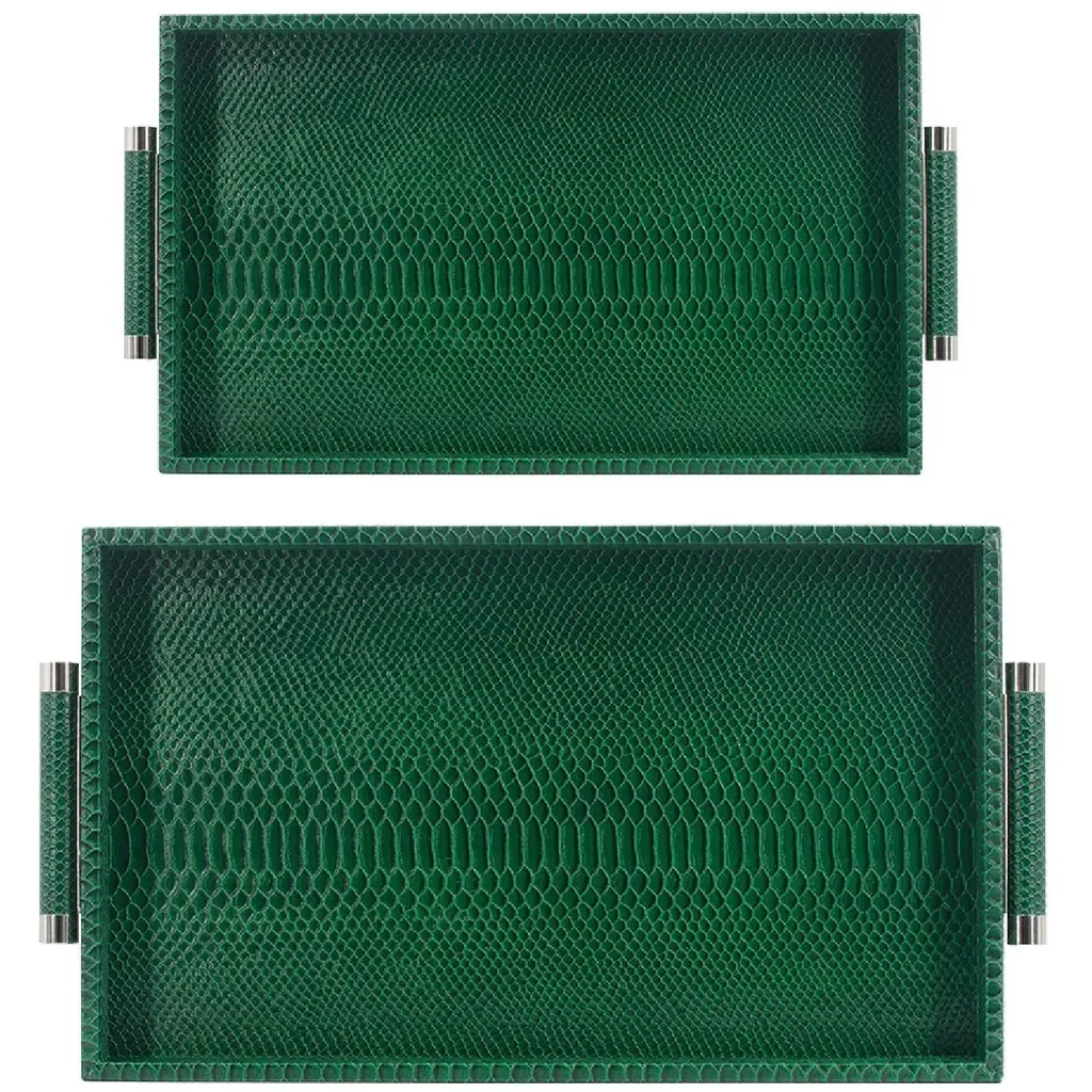 The set of 2 Morelet trays adds a touch of drama to your room with their deep green color. Accented with sophisticated croco texture and touches of silver these trays are a stylish way to organize your space.