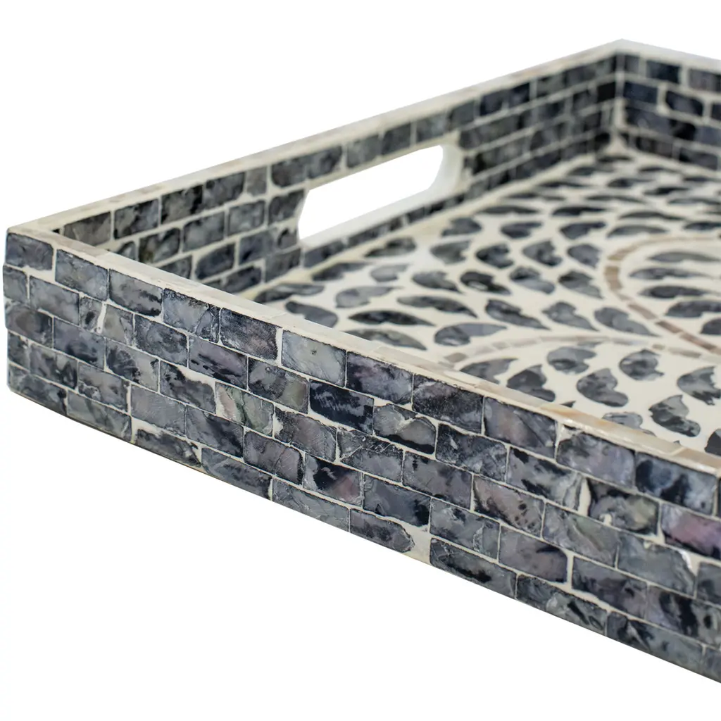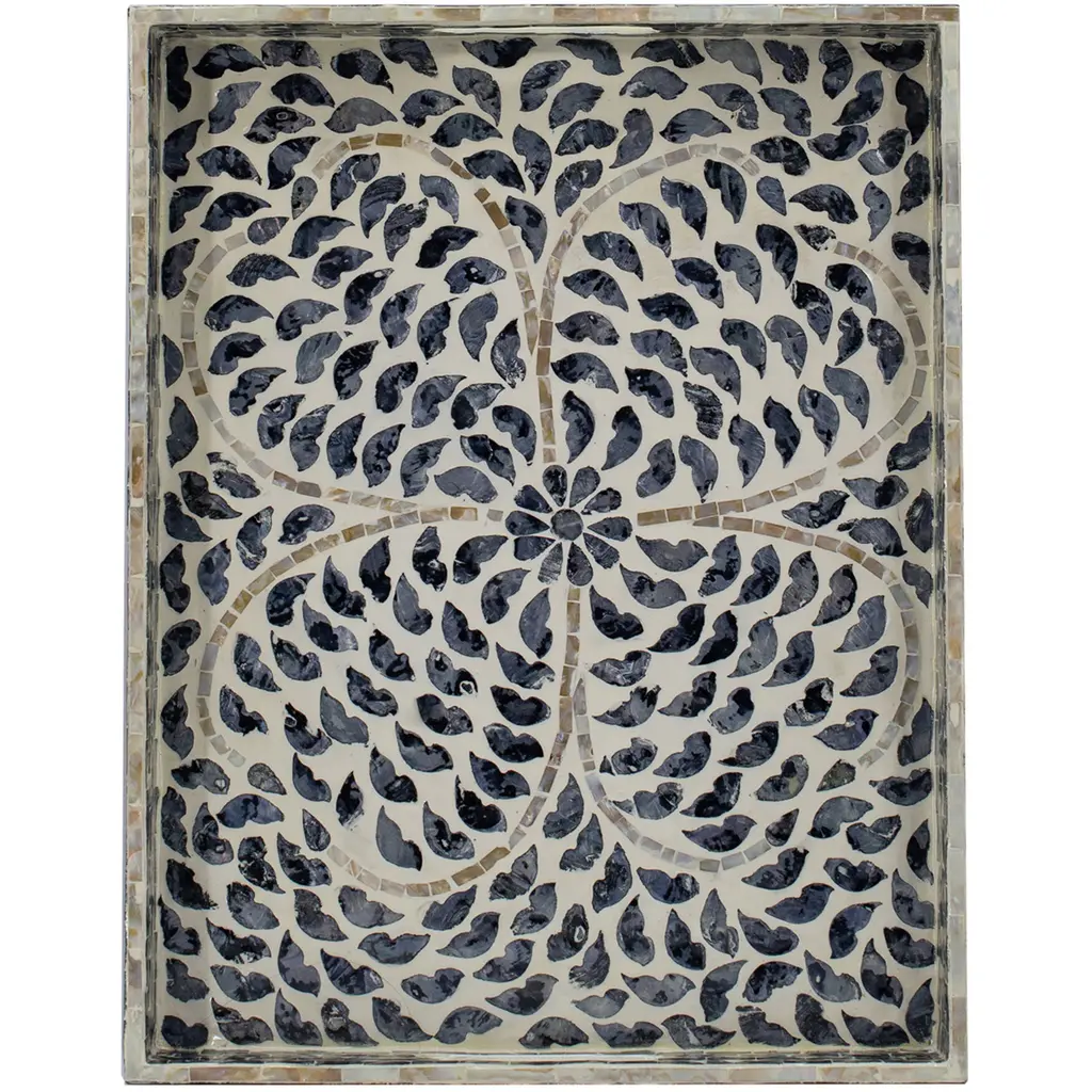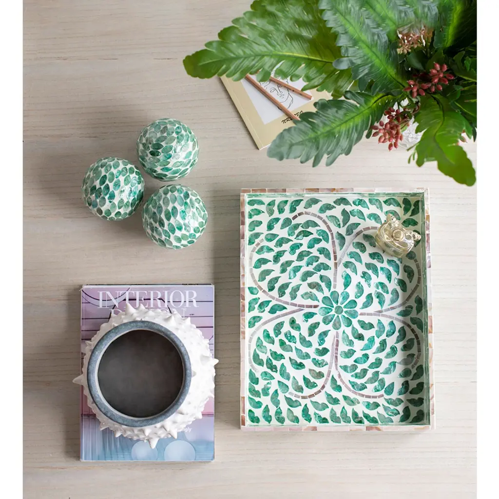 Visually impressive and undeniably useful, this large green Capiz tray with handles has a dynamic and dutiful look. The rectangular frame presents a floral design along the surface, while the side handles bring appealing convenience. Staged on the buffet or used in the kitchen, this tray makes for a very effective accent piece.