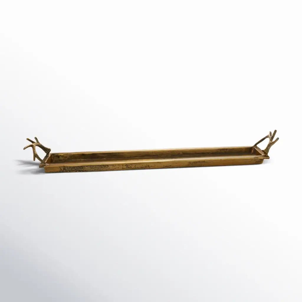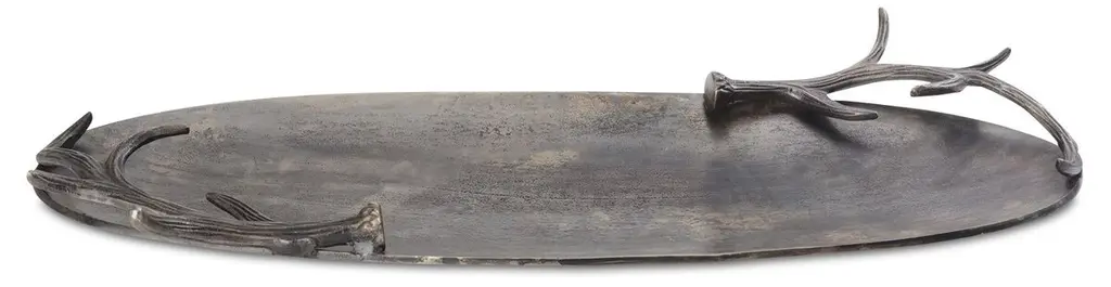 Show off your outdoorsy side with this sophisticated Antler Oblong Tray from Arthur Court. Sweeping horns adorn the sides of this sleek, 19-inch tray, creating unique, textured handles. Handcrafted in sand-cast aluminum, this tray's interior gleams brilliantly against the intricate detail within the antlers.