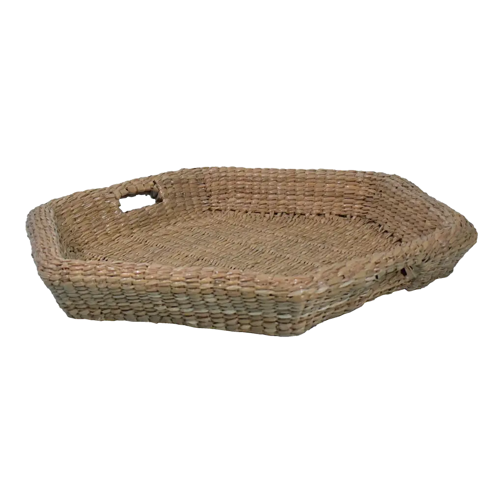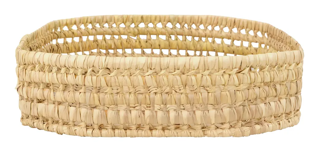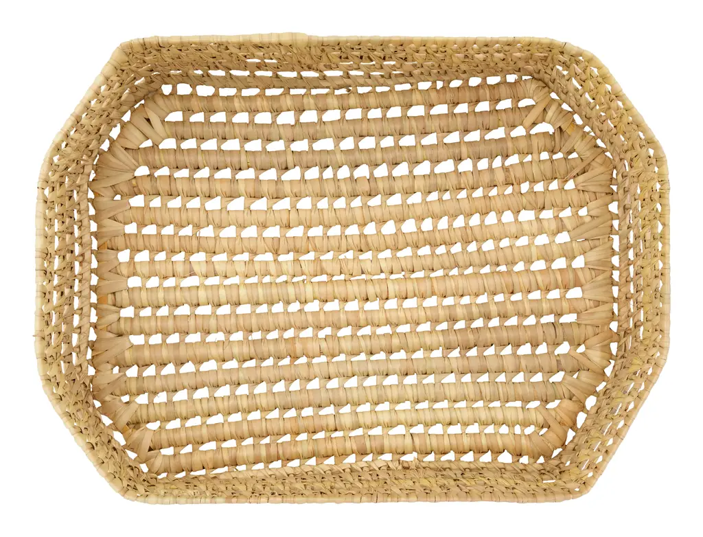 Add a little texture to any tabletop vignette with our Anwar Tray. This global-chic beauty comes to us from Morocco, where it was handwoven from natural rattan into an oversized octagonal shape. Perfect for keeping things tidy in any room of the house, we love it for corralling papers and office supplies at a workspace; holding candles, magazines and florals on a scaled-up coffee table; or filled with booze and glassware on the sideboard for a boho-inspired bar setup. •handwoven rattan •morocco•each is unique; variations in shape, size and natural characteristics should be expected Dimensions•approximately 21"W x 16.25"D x 4.5"H