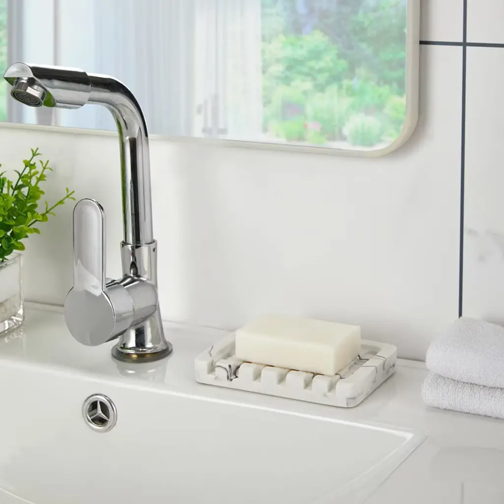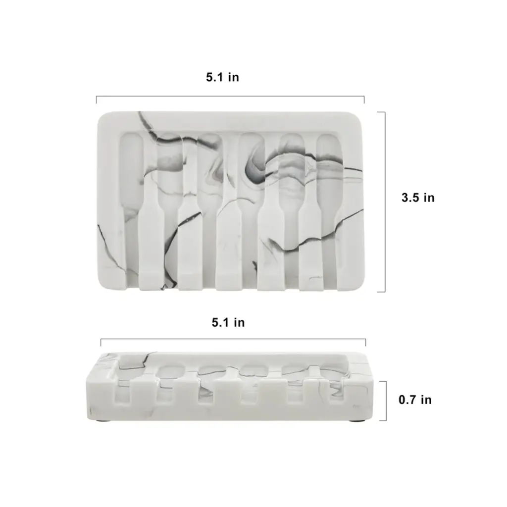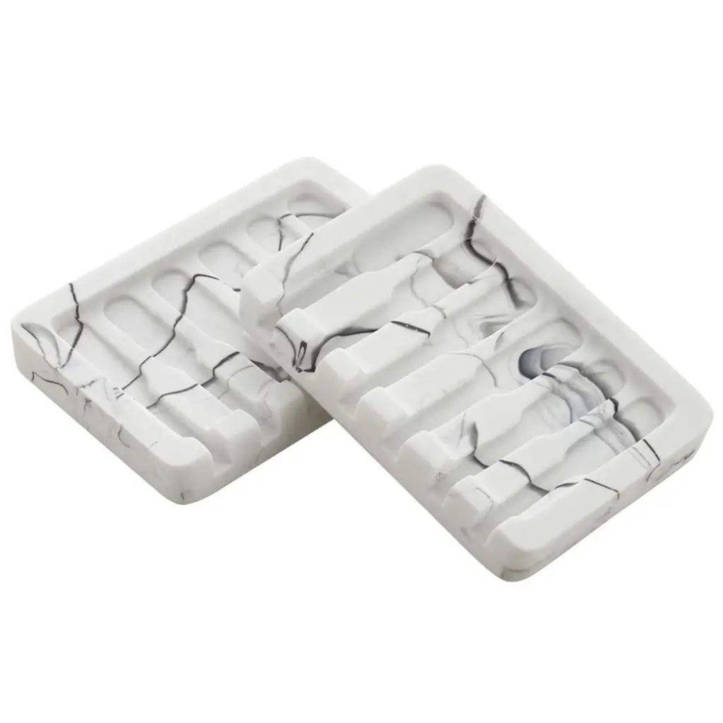 Upgrade your bathroom and kitchen with these self - draining soap dish holders. They come in a set of 2. The soap dish has a beautiful marble - like pattern in white with black streaks, adding a touch of elegance to your space. Crafted from sturdy resin, it offers better durability compared to plastic or wood. The self - draining feature with slanted drain slots is a game - changer. It allows excess soapy water to drain away rapidly, preventing the soap from turning mushy and soft, which means your soap lasts longer. It can hold a bar soap and a sponge, keeping your essentials in one place. The rubber feet on the bottom protect your countertop from scratches. Whether it's in the bathroom shower or the kitchen sink, these soap dishes are perfect for daily use, bringing convenience and style to your life.