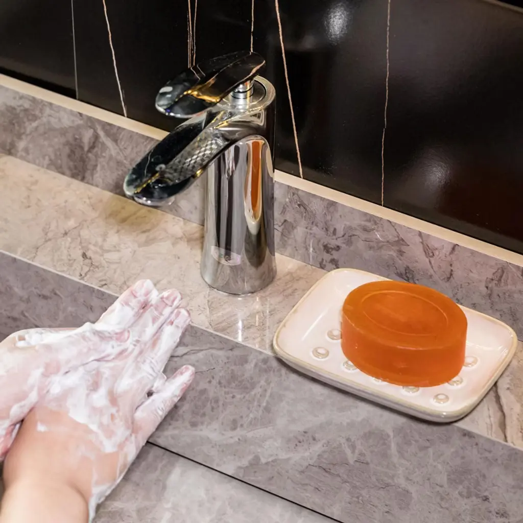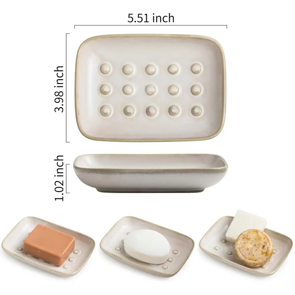 Discover this ceramic soap dish, a must - have for your bathroom or kitchen. Crafted from high - quality ceramic, it's built to last, resistant to scratches, stains, and rust. The smooth surface is easy to clean and can even go in the dishwasher. With a large capacity, it can hold 1 - 2 pieces of dry soap of various shapes. The wide bottom keeps it stable, especially in damp areas. Its unique floating point design is a game - changer. It prevents water from pooling, so your soap stays dry and doesn't stick to the dish, saving you from soap waste. This soap dish isn't just for soap; it can store sponges, jewelry, and other small items, helping you keep your countertop tidy. It can also be used as a spoon rest in the kitchen. Whether it's in your bathroom, kitchen sink, bath, or hotel, it not only serves a practical purpose but also acts as a unique decoration, enhancing the overall look of the space. Say goodbye to clutter and hello to a more organized and beautiful living environment.