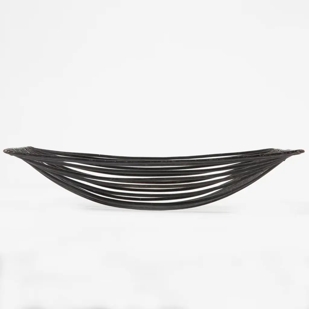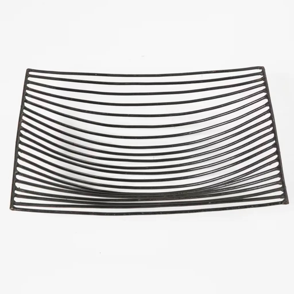 Practical square black tray made of galvanised iron wire (a pliable material the artist loves). The edge is crossed by parallel bars that remain straight on either end and bend into a concave bottom in the middle. Occasional maintenance is advised with furniture wax.
