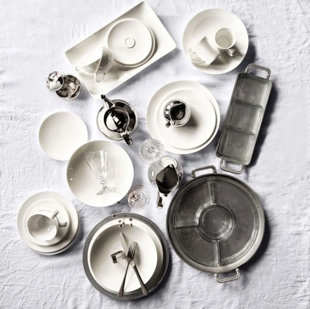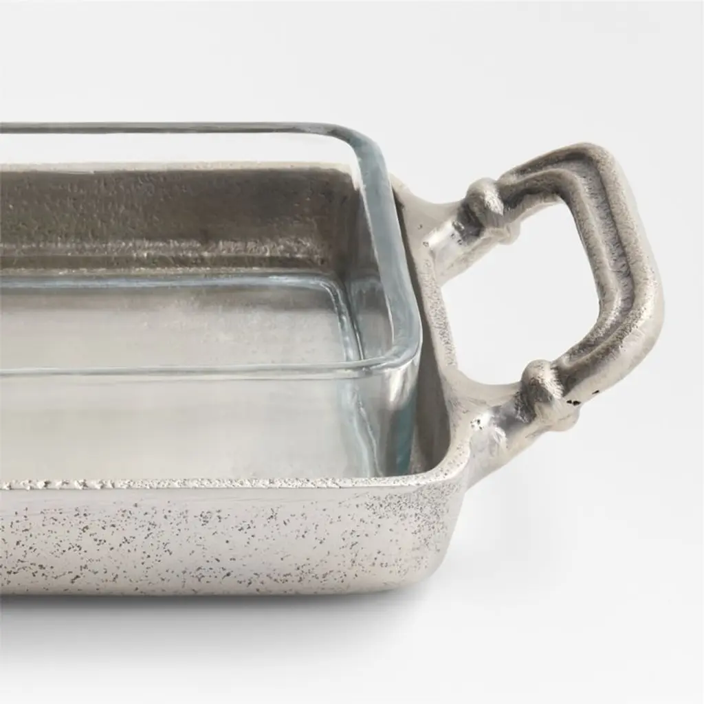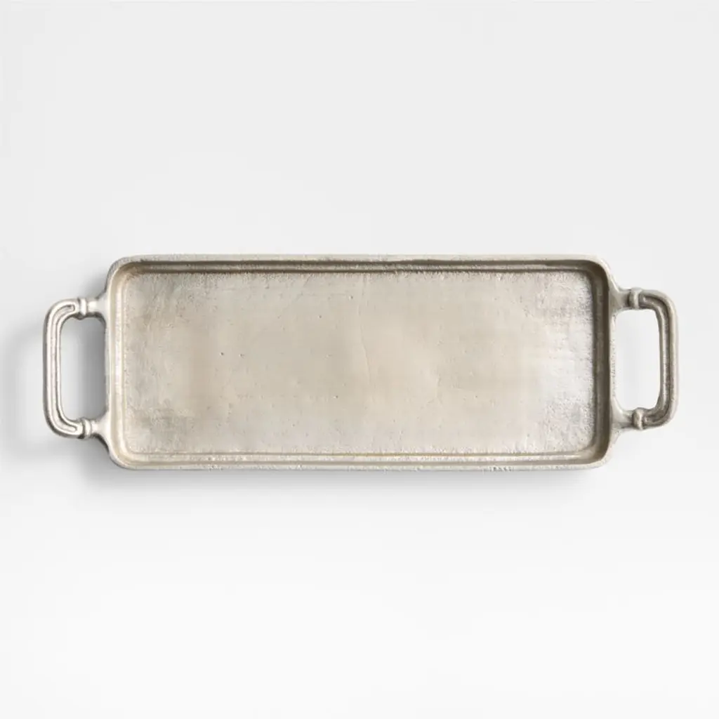 Inspired by heirloom English silver, Argento imbues serving pieces with a vintage vibe. Each hand-polished aluminum piece gets its antique appearance from subtle texture and markings imparted during the casting process and a finish resembling time-worn pewter. A simple shape and handles with just the right amount of decorative detailing give the rectangular serving tray a look that's both timeless and contemporary. Three square glass bowls fit securely in the server, providing a divided presentation of old-school relish trays or chef-forward shareables.
