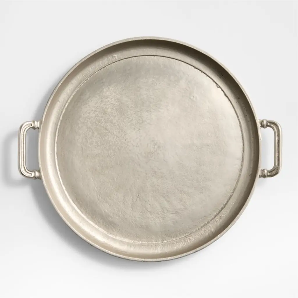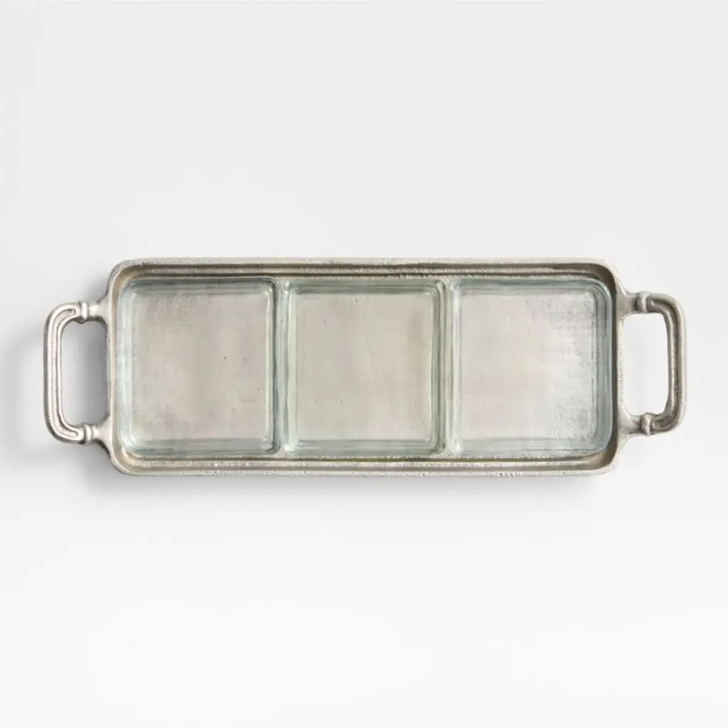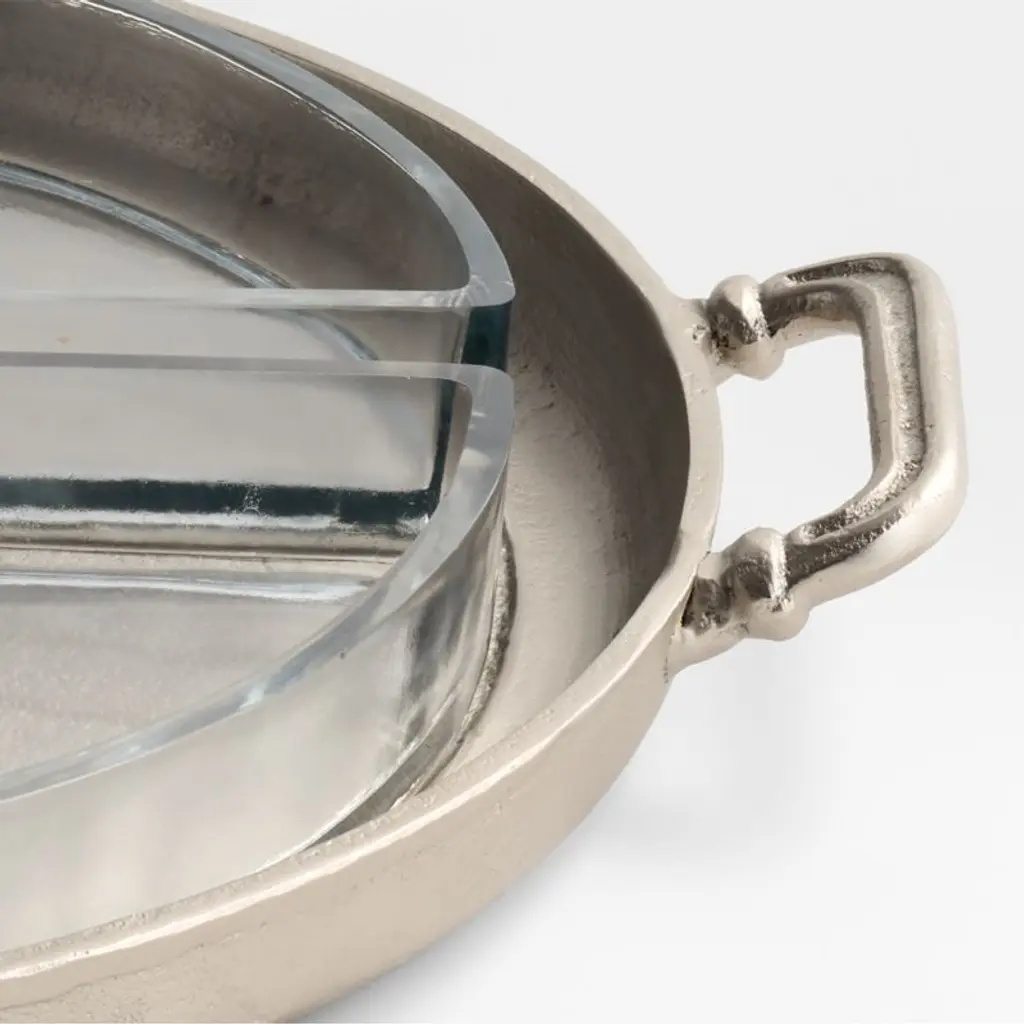 Inspired by heirloom English silver, Argento imbues serving pieces with a vintage vibe. Each hand-polished aluminum piece gets its antique appearance from subtle texture and markings imparted during the casting process and a finish resembling time-worn pewter. A simple shape and handles with just the right amount of decorative detailing give the round serving tray a look that's both timeless and contemporary. A center round bowl and three semi-circular surrounding containers made of clear glass fit securely in the server, providing a divided presentation of old-school relish trays or chef-forward shareables.