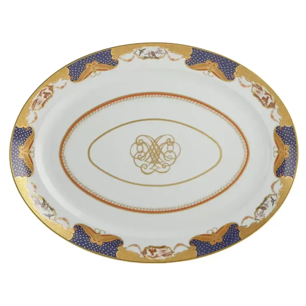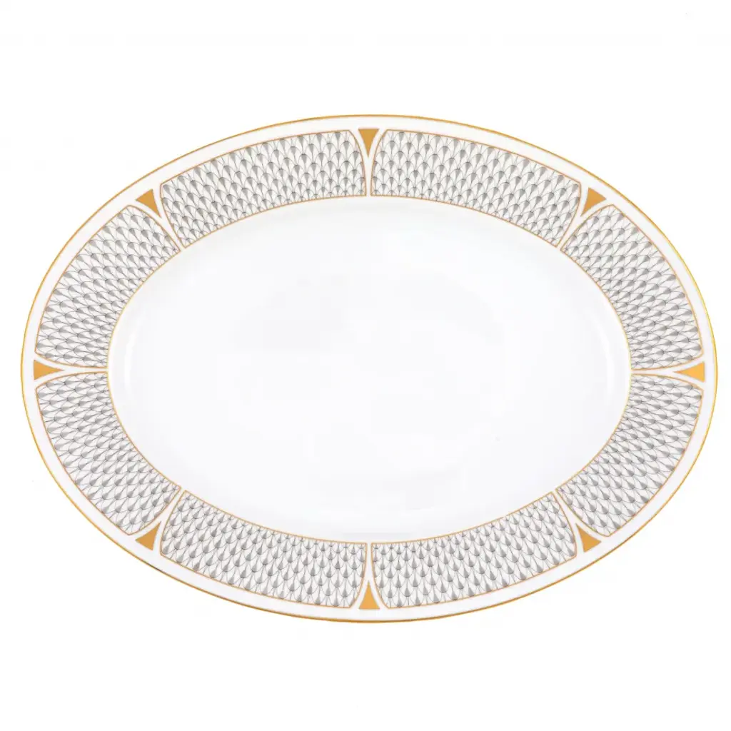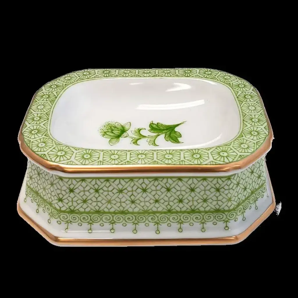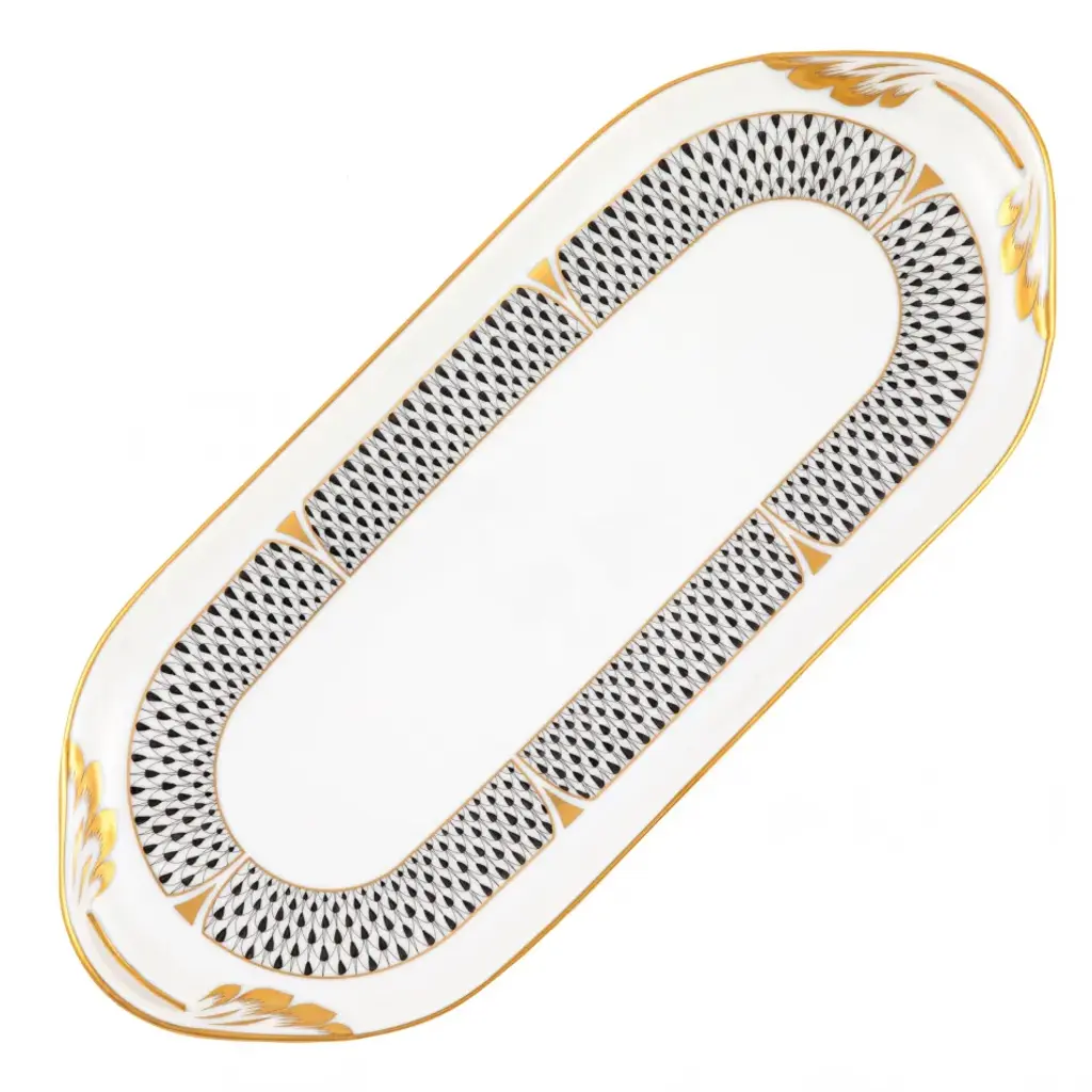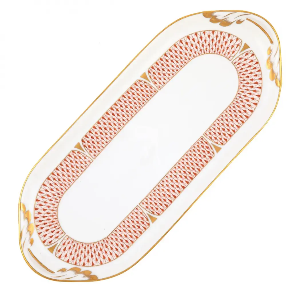 Herend fishnet lovers can rejoice since their favorite design has made the leap to dinnerware. The Art Deco pattern combines the fishnet motif with geometric inflection points in 24K gold which add dramatic pops of interest. Together, these two styles contribute a captivatingly modern composition to the Herend oeuvre. Handpainted in Hungary. Now the biggest porcelain manufactory in Europe, Herend was founded in 1826 to produce earthenware in the small Hungarian village for which it was named. At the time, Hungary was flooded with low-cost pottery, but in 1839, Mor Fischer became the Manufactory’s new owner and he decided to focus on producing dinnerware replacement pieces for Europe’s royal families to complement their valuable porcelain patterns from Germany and the Far East. As his client base grew, Fischer commissioned his artists to begin designing dinnerware patterns of their own. Queen Victoria’s 1851 purchase of a large set for Windsor Castle was a milestone, setting the stage for aristocrats throughout Europe to clamor for Herend in their estates. In the 1850s, Herend added meticulously-crafted figurines to its creations. Herend’s trademark fishnet pattern, which is widely recognized and prized as Herend’s signature design, started in 1858 when an artist who was intrigued with a Chinese plate’s fish scale design painted it onto a rooster figurine to imitate feathers.
