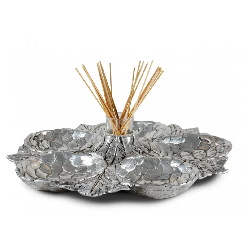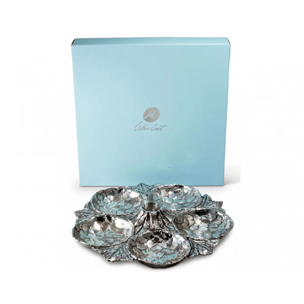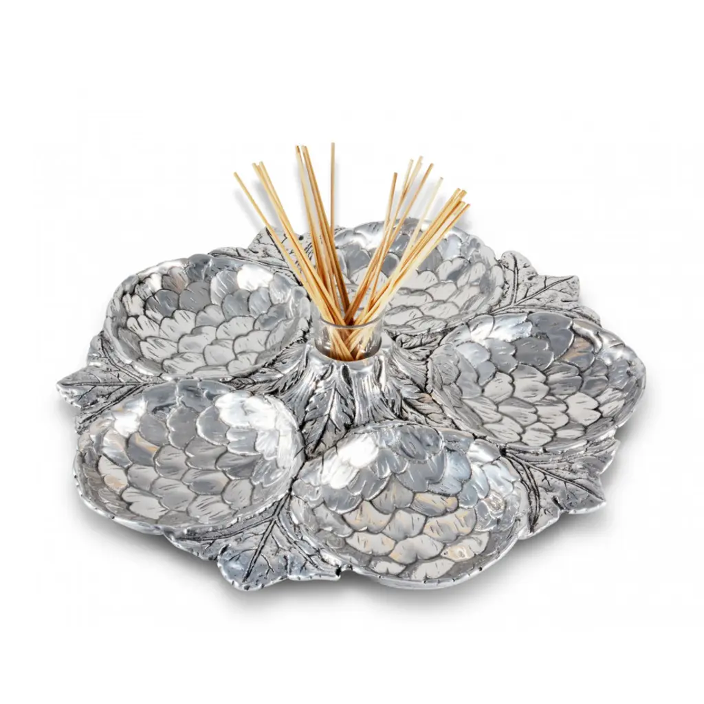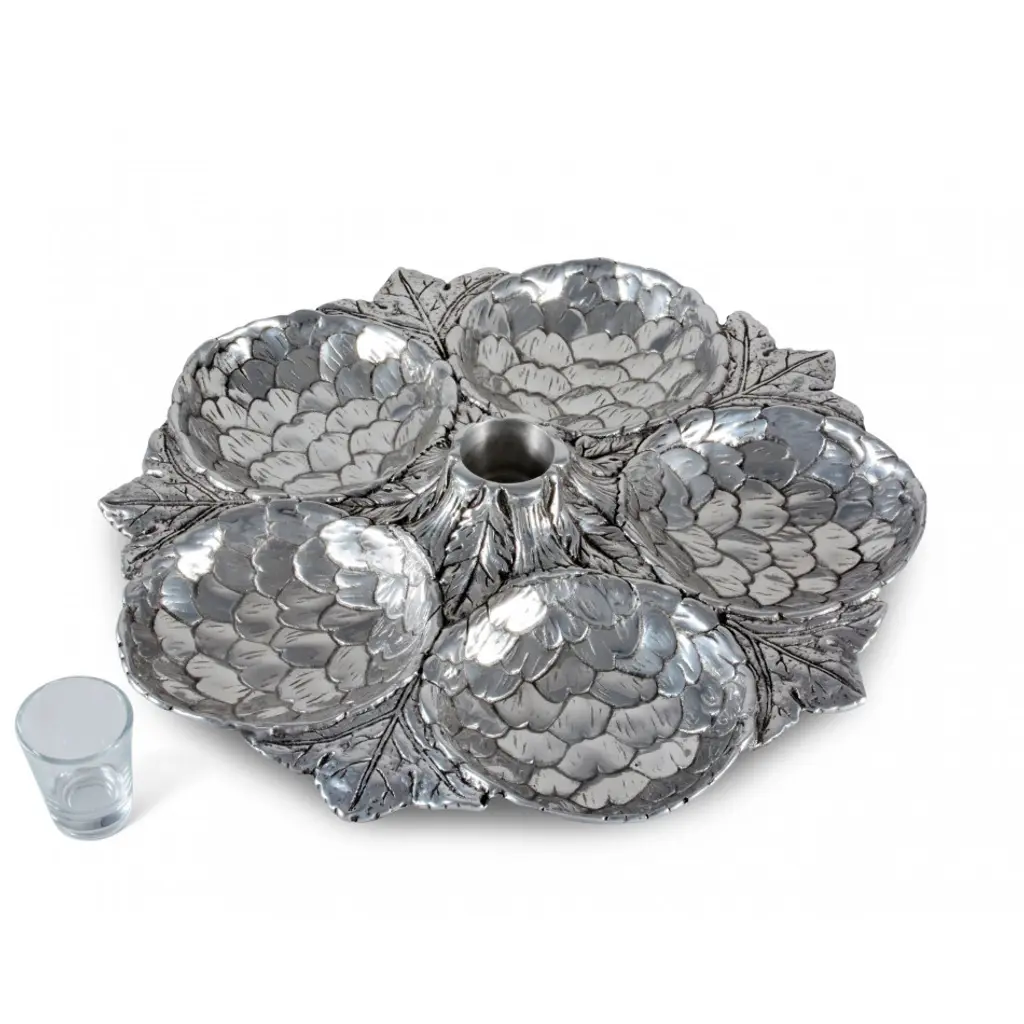 Five amazingly detailed Globe artichoke “bowls” arranged in a circle on a bed of feathery artichoke leaves connected to a votive-sized glass holder in the middle, this tray is a stunning way to serve an assortment of crudités, olives or any antipasto collection. The glass holder in the middle will hold picks, hors d'oeuvres forks or even a tealight candle.