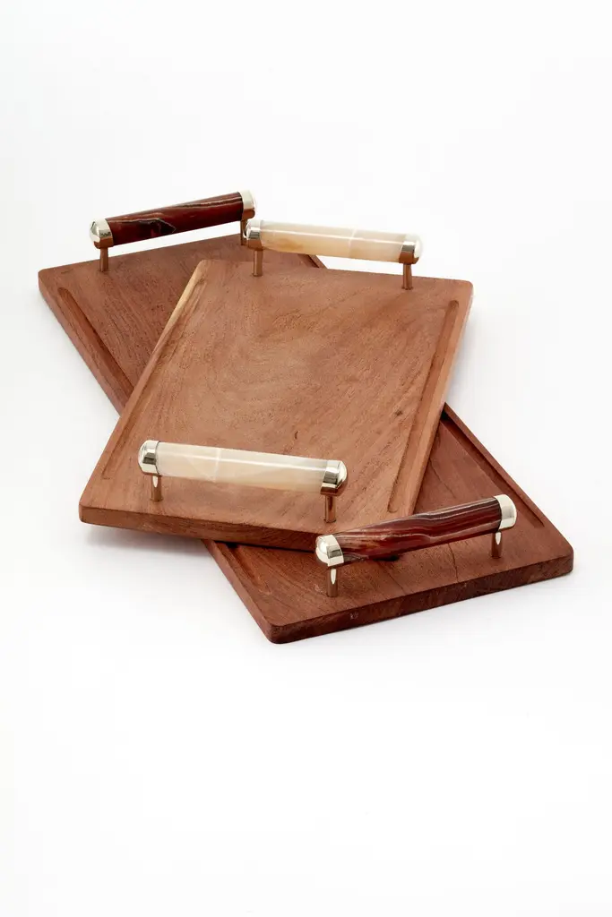 Introducing these exquisite "Asado" algarrobo wood serving boards, adorned with onyx and silver alpaca stone handles. Crafted with utmost care, these boards are perfect for showcasing meats or cheeses, making them an excellent choice for delighting friends and family. Handmade by skilled artisans, they come in two different sizes and offer the option to choose onyx handles in black, blue, burgundy, or cream. Elevate your dining experience with these stunning and versatile serving boards.Our pieces are made by hand. One of a kind.All natural wood & onyx stone may vary in color.