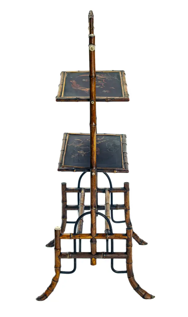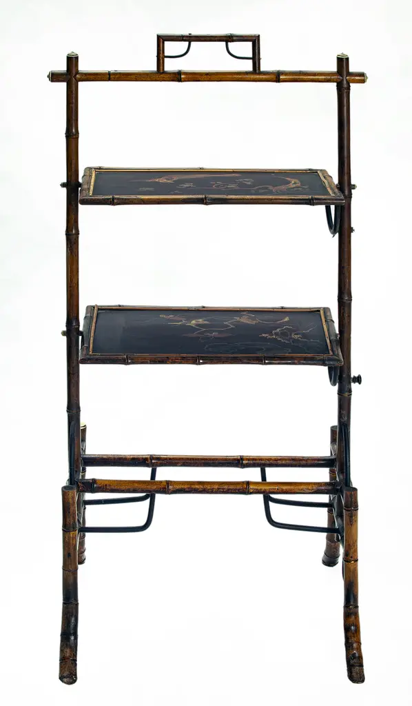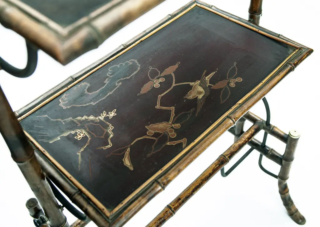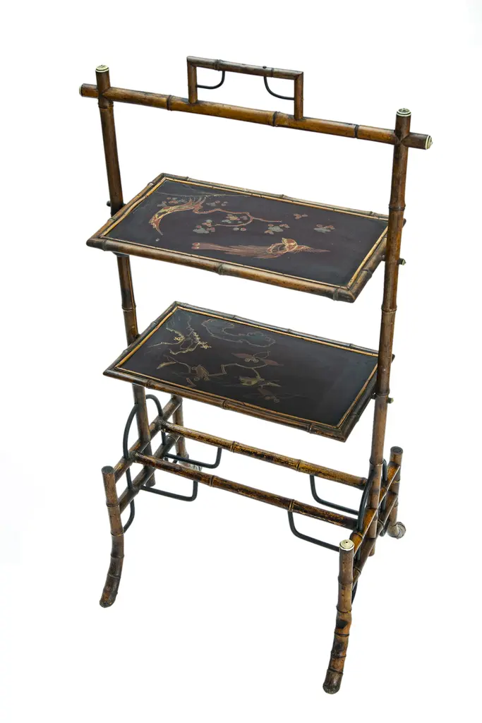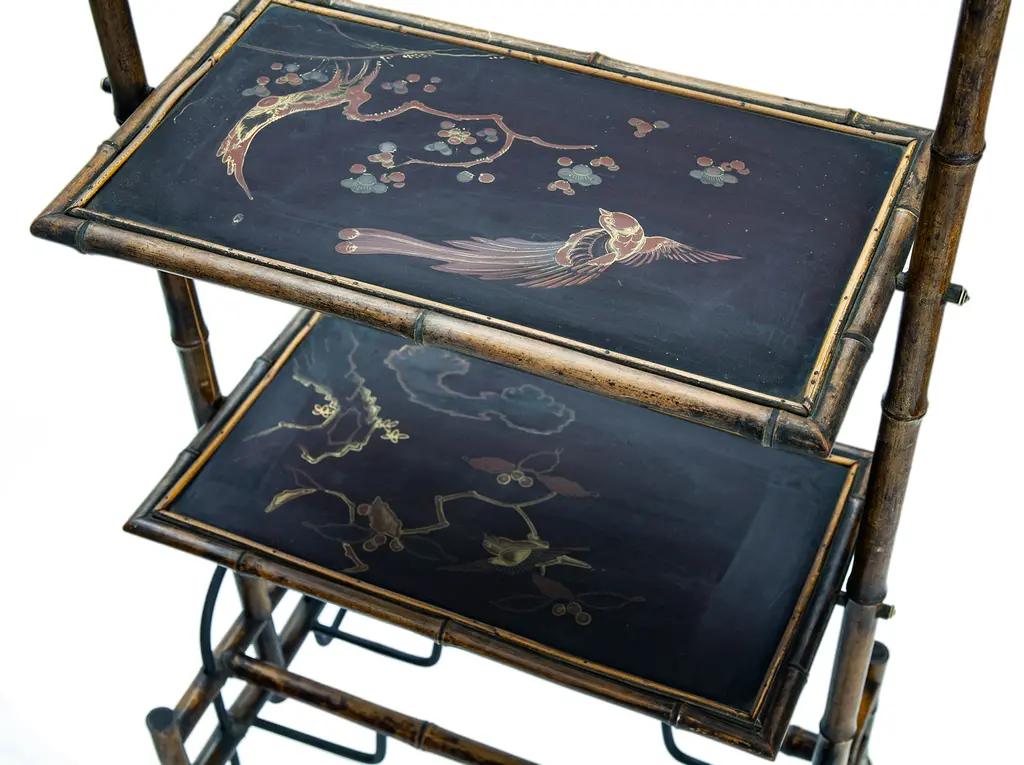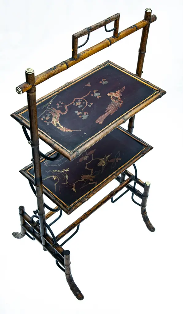 Asian bamboo tray table with handpainted with birds & branches. A handle on the top for moving around easily. The painted motif is visible on both trays. There are two shelves to use as a side table or perhaps a drink or for hors d’oeuvres tray. The trays display the painting when in the upright position. The frame is blonde tortious bamboo. Height: 41"x Width: 21x Depth: 18. Reduced from 1495.