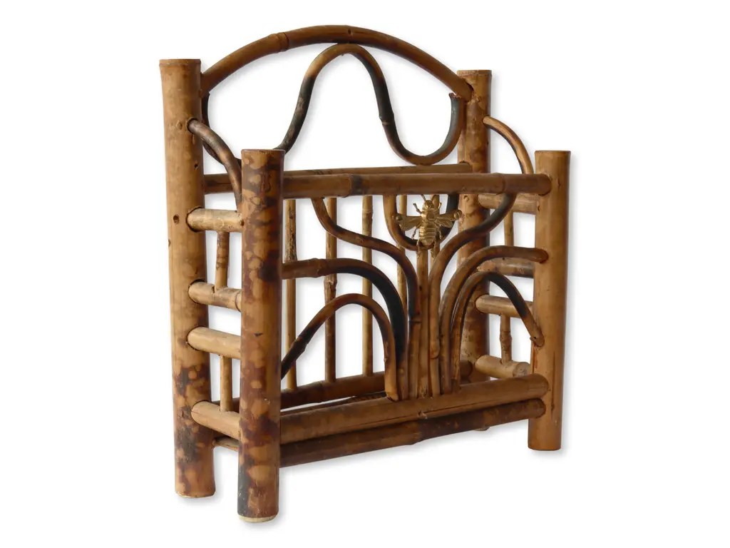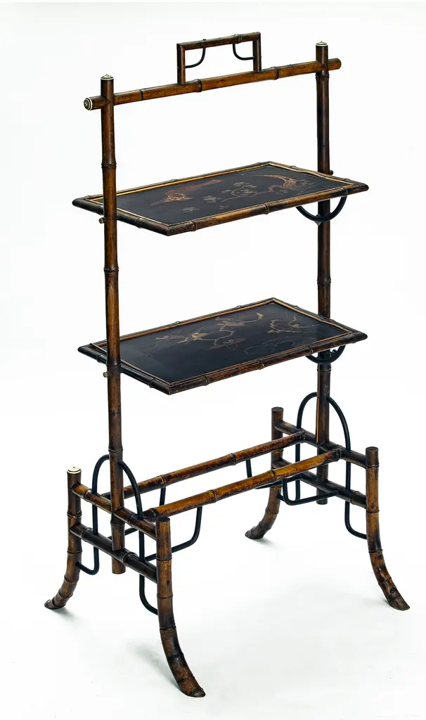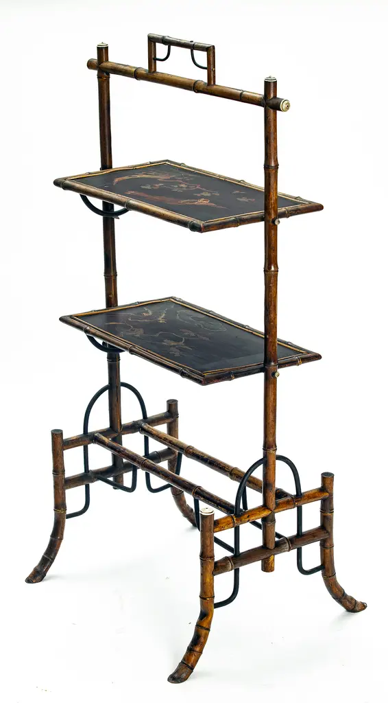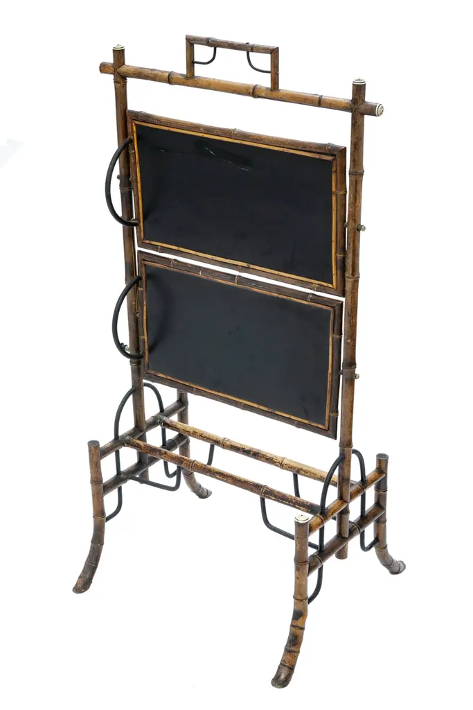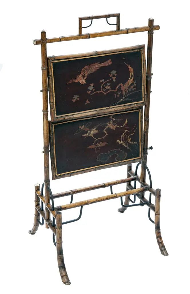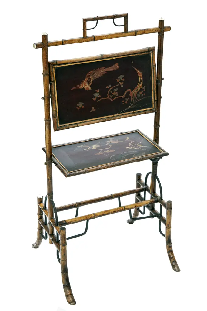 Asian bamboo tray table with handpainted with birds & branches. A handle on the top for moving around easily. The painted motif is visible on both trays. There are two shelves to use as a side table or perhaps a drink or for hors d’oeuvres tray. The trays display the painting when in the upright position. The frame is blonde tortious bamboo. Height: 41"x Width: 21x Depth: 18. Reduced from 1495.