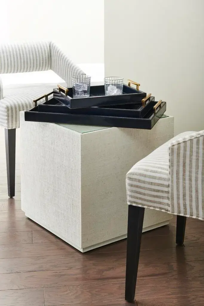 Set of three midnight blue leather trays with distinctive gold handles. Use them together or seperatley, a handsome addition to any living spaces. Medium-3"h x 18 1/2w x 12 1/4"d, small-3"h x 14"wx 101/4"d.