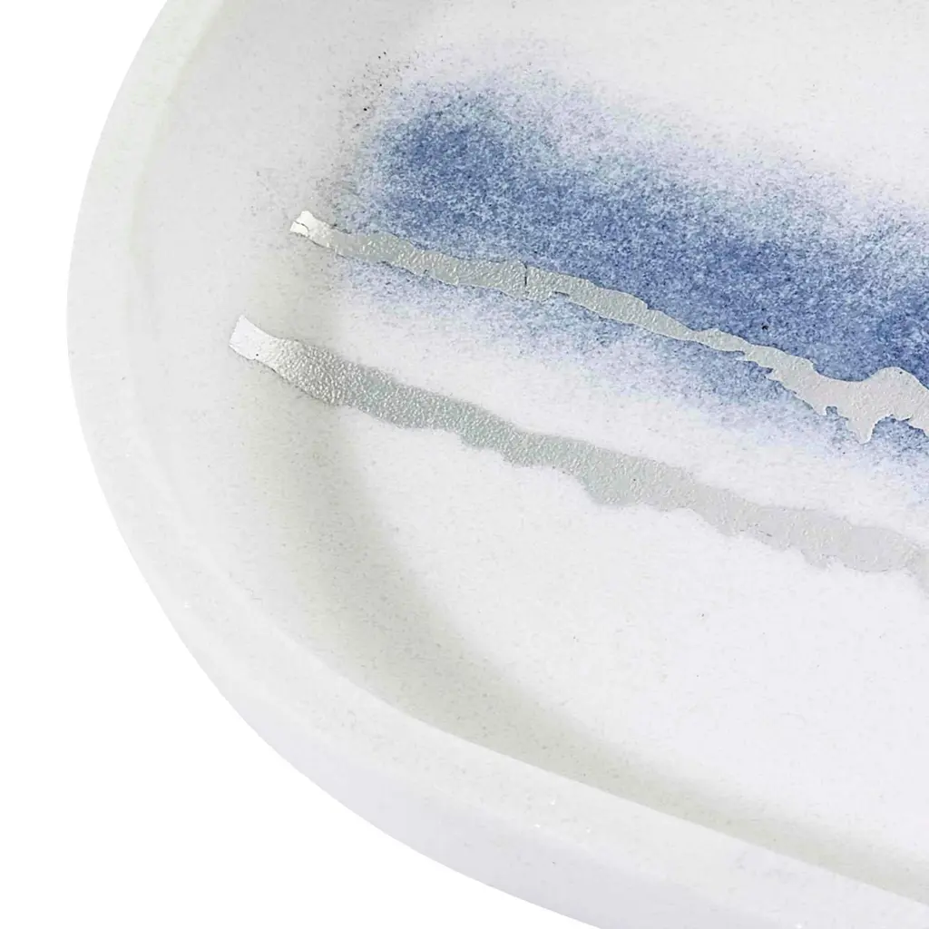The Avanti Murano Tray features a marble look with a matte white base and irregular horizontal bands of light grey, dark grey and silver. No two pieces are the same. Made of durable resin. Imported.