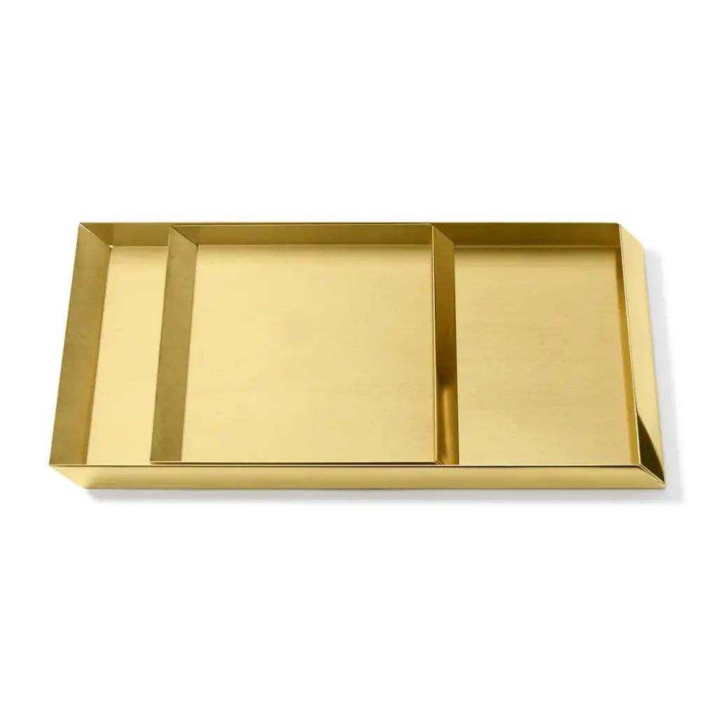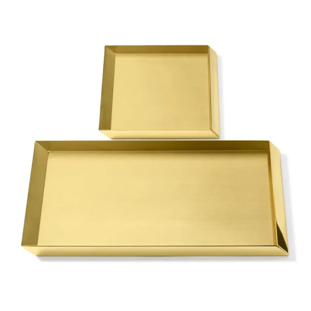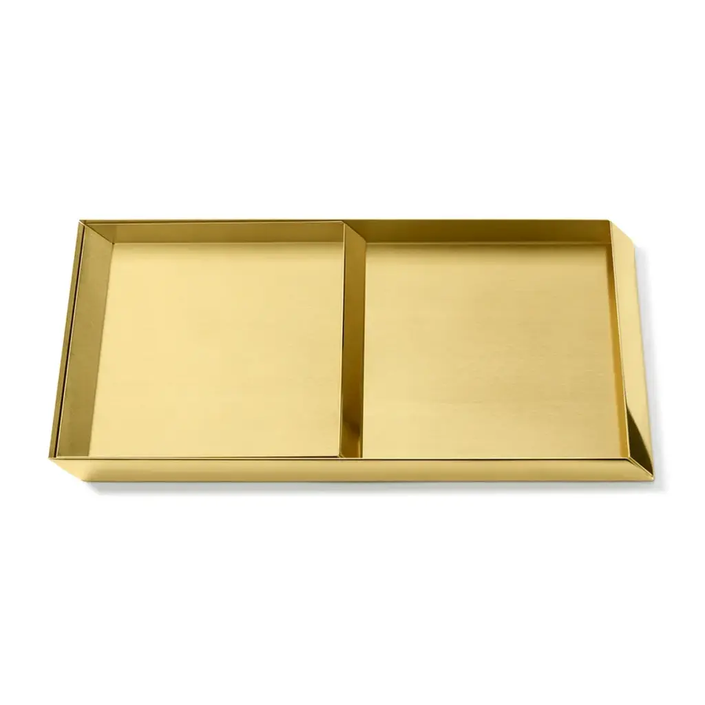 Version available:EG609PB105 Tray A4: 35,4x23x2H cmEG609PB107 Trays Set: 45X27,5X2,5H (27X22,5X2,5H) cmEG609PB109 Rectangular Small Tray: 18x12x2H cmEG609PB110 Squared Small Tray: 20x20x2H cmTrays in brass, copper and stainless steelThe compositional scheme of this family of small trays is the axonometric isometric projection of two parallelepipeds which creates a three-dimensional optical effect implemented by inclined edges and by contrasting metal finishes. Like in a game, you can get as many configurations as you wish, always creating different designs.