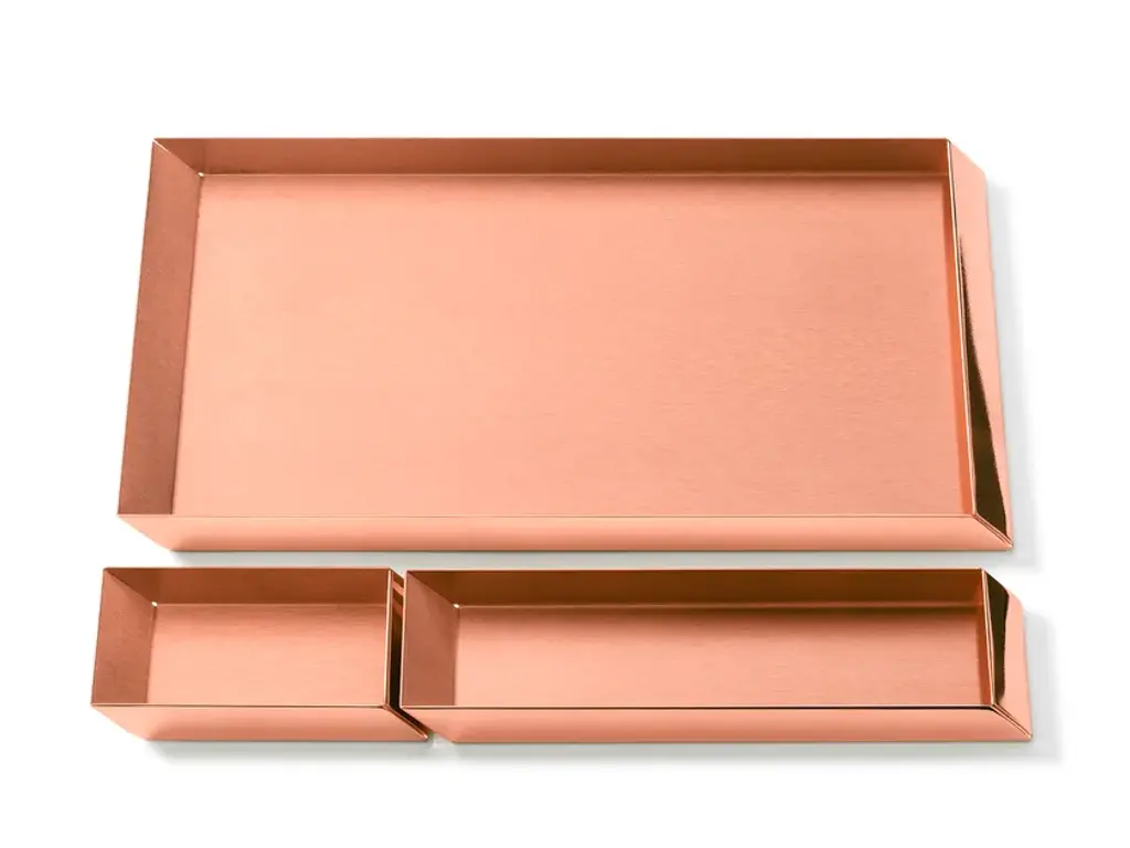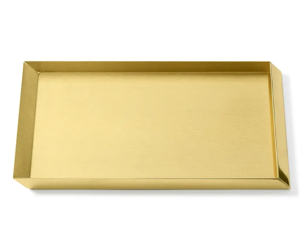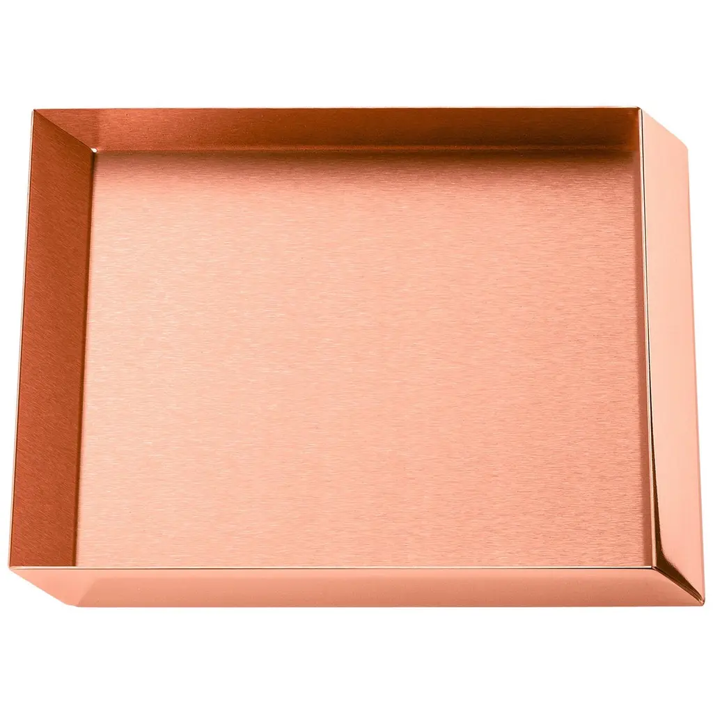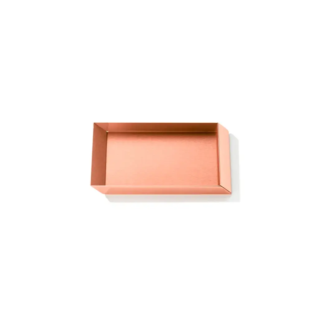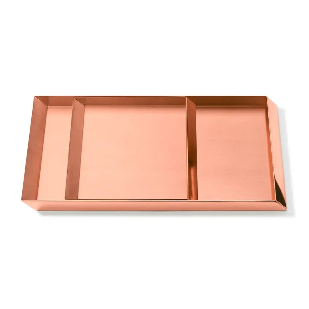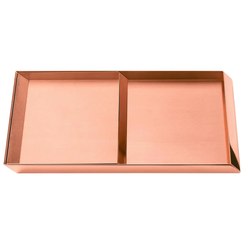 Version available:EG609RG105 Tray A4: 35,4x23x2H cmEG609RG107 Trays Set: 45X27,5X2,5H (27X22,5X2,5H) cmEG609RG109 Rectangular Small Tray: 18x12x2H cmEG609RG110 Squared Small Tray: 20x20x2H cmTrays in brass, copper and stainless steelThe compositional scheme of this family of small trays is the axonometric isometric projection of two parallelepipeds which creates a three-dimensional optical effect implemented by inclined edges and by contrasting metal finishes. Like in a game, you can get as many configurations as you wish, always creating different designs.