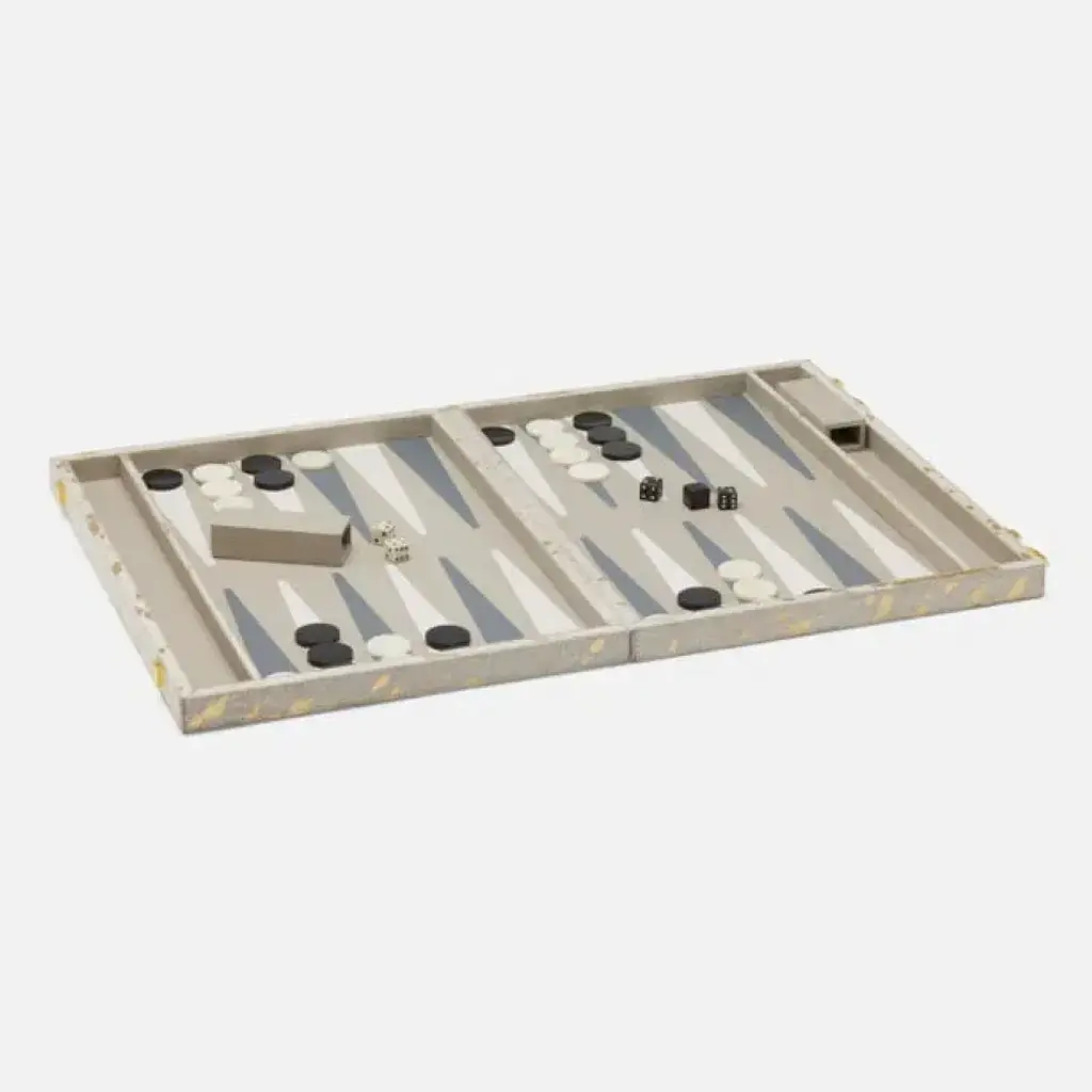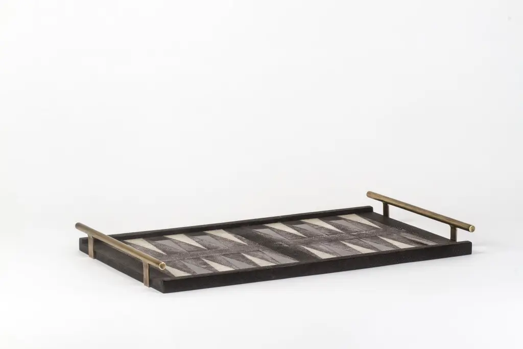 The Paris based label has distinguished themselves since their launch, with their iconic use of shagreen mixed with brass and other exotic materials. All furniture is handcrafted by skilled artisans, ultimately making each piece unique, designed in Paris and produced in the Philippines.The KIFU PARIS Backgammon Game Tray is the ultimate luxury game. Accented with a mixture of shagreen, pen shell and bronze-patina brass this piece comes with all game parts in a velvet pouch. Available in a light or dark color-way.The dimensions of this piece are 60 x 34.5 x 5 cmAll Kifu Paris pieces are handmade by artisans, ultimately making each piece unique.Custom color/sizing available on request.Wipe clean with soft dry cloth.Although inspired by her parents, her collection of Home Accessories and Furniture is a distinct identity of its own. Kifu uses handmade techniques of elaborate inlay patterns of shagreen, shells, semi-precious stones, materials she experienced as a child growing up in her parent’s studio, but interpreted in a younger quirkier way reflecting her youth. From her "jewelry inspired knobs" on decorative boxes, gold bar boxes and an extravagant inlay pattern mix of shagreen and shell inspired by galactic constellations, as seen on her enormous round mirror, is refreshing to see. Kifu embodies whimsical elements throughout her collection and is not afraid to be daring and unexpected in her approach to design. All shagreen-covered items should be kept out of direct sunlight, color variants may occur on the stingray and other exotic finishes, but this showcases the Parisian label's commitment to creating authentic luxurious products using natural components.